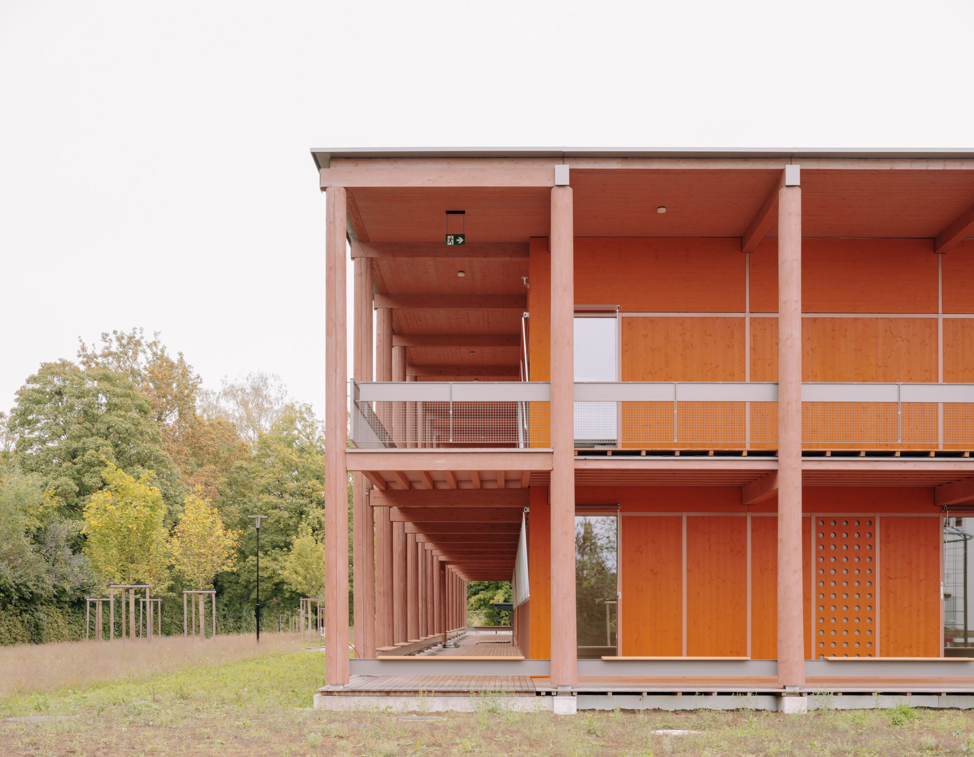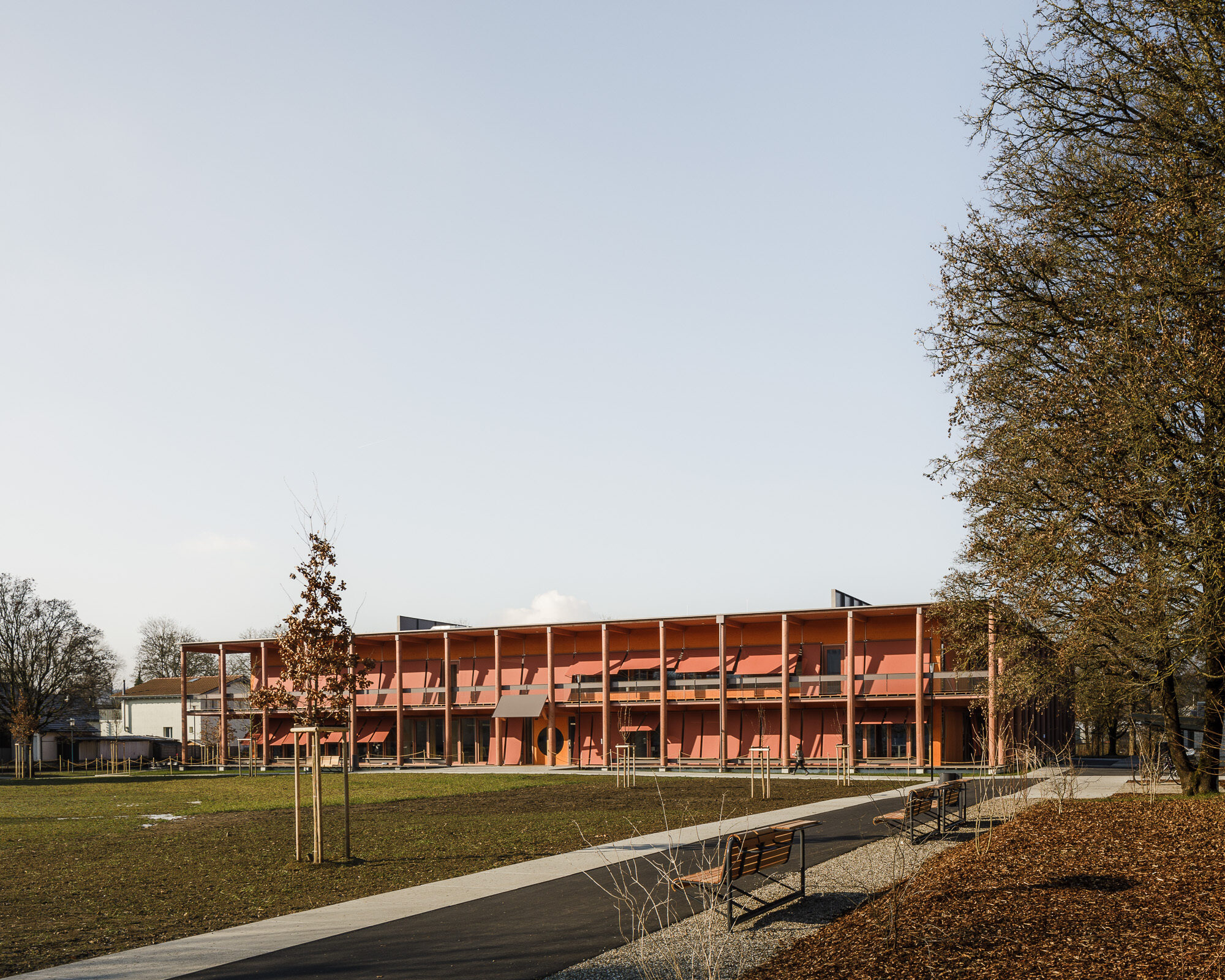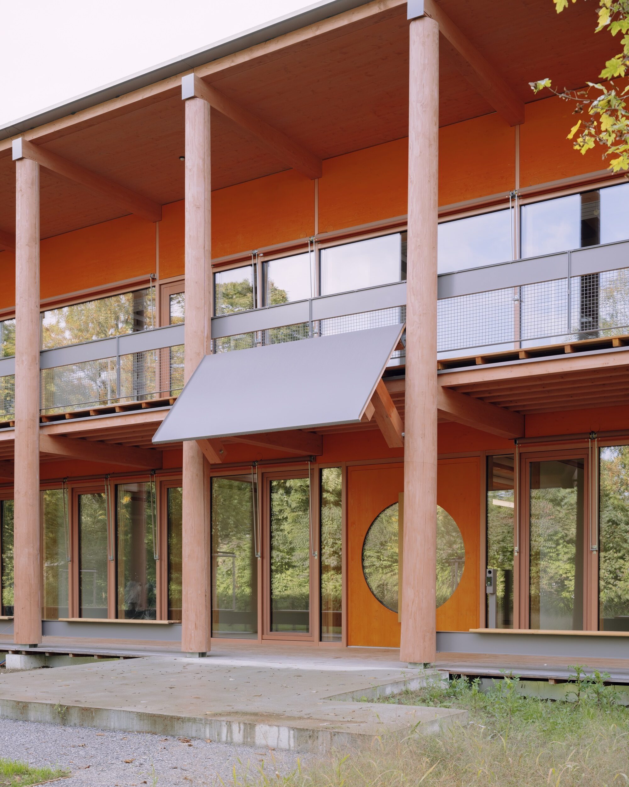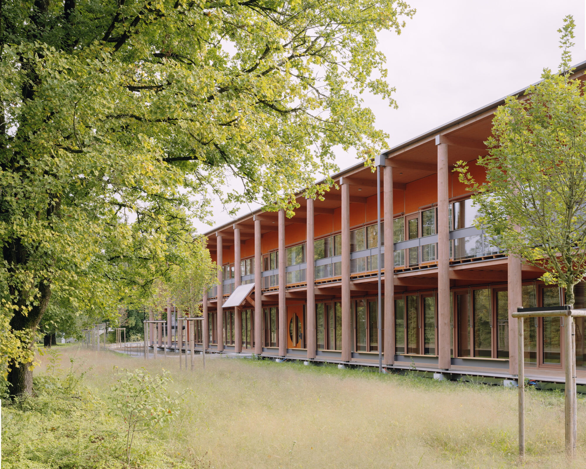 Ein gedeckter Außenraum umgibt das Gebäude und dient als vermittelnder Raum zwischen Gebäude und Außenbereich, wodurch eine hohe Aufenthaltsqualität für die Nutzer entsteht.