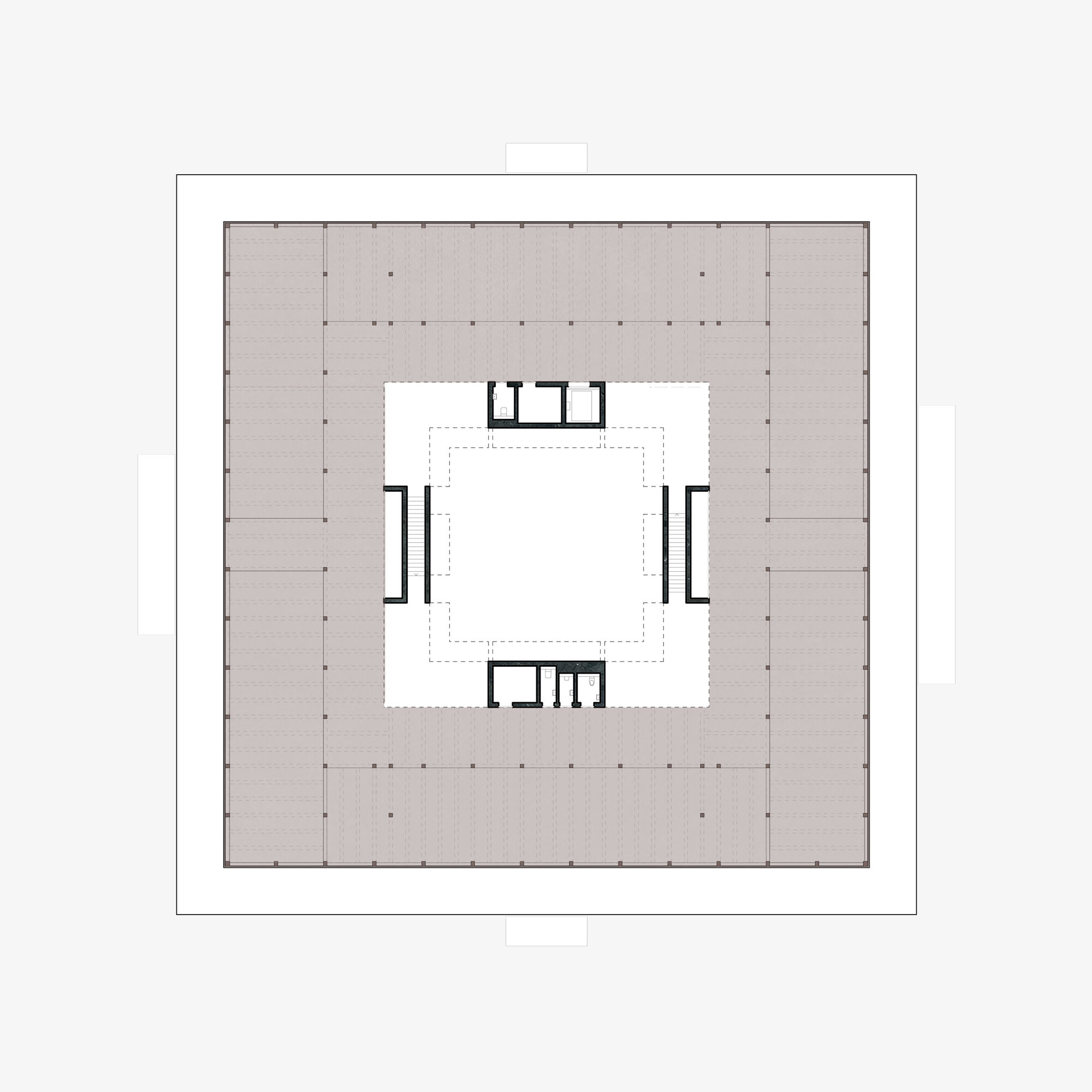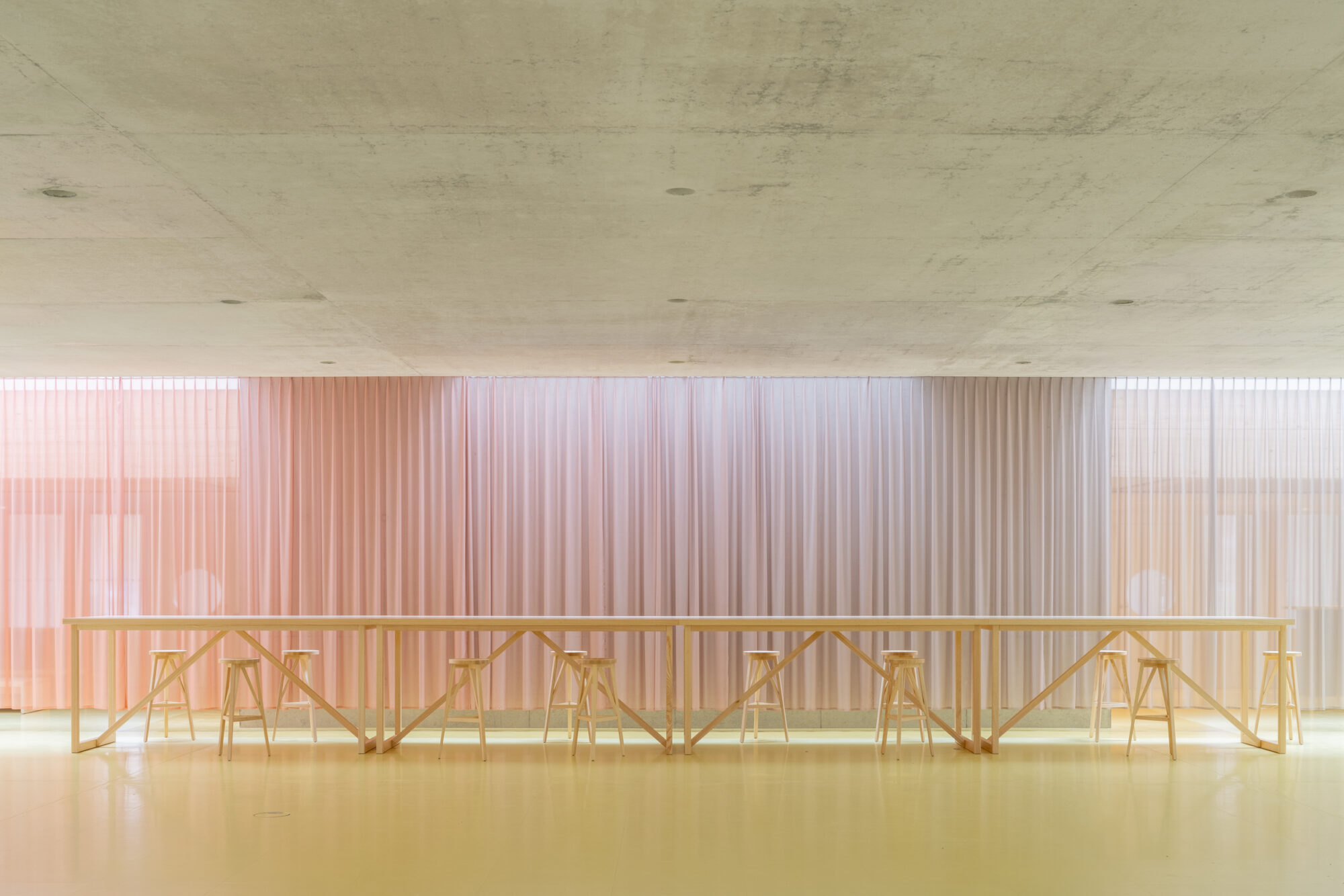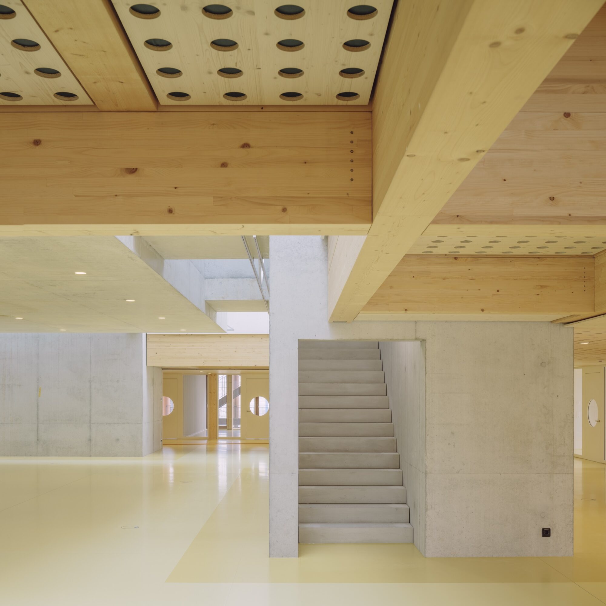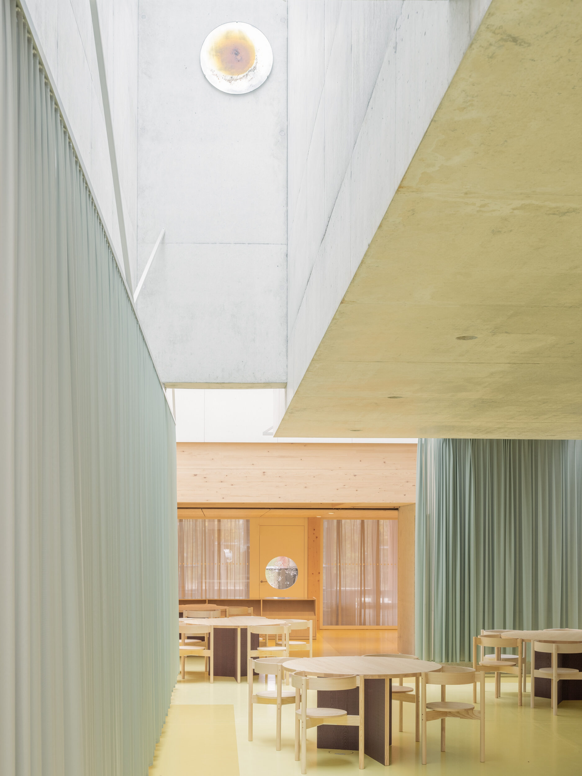 Ein gedeckter Außenraum umgibt das Gebäude und dient als vermittelnder Raum zwischen Gebäude und Außenbereich, wodurch eine hohe Aufenthaltsqualität für die Nutzer entsteht.
