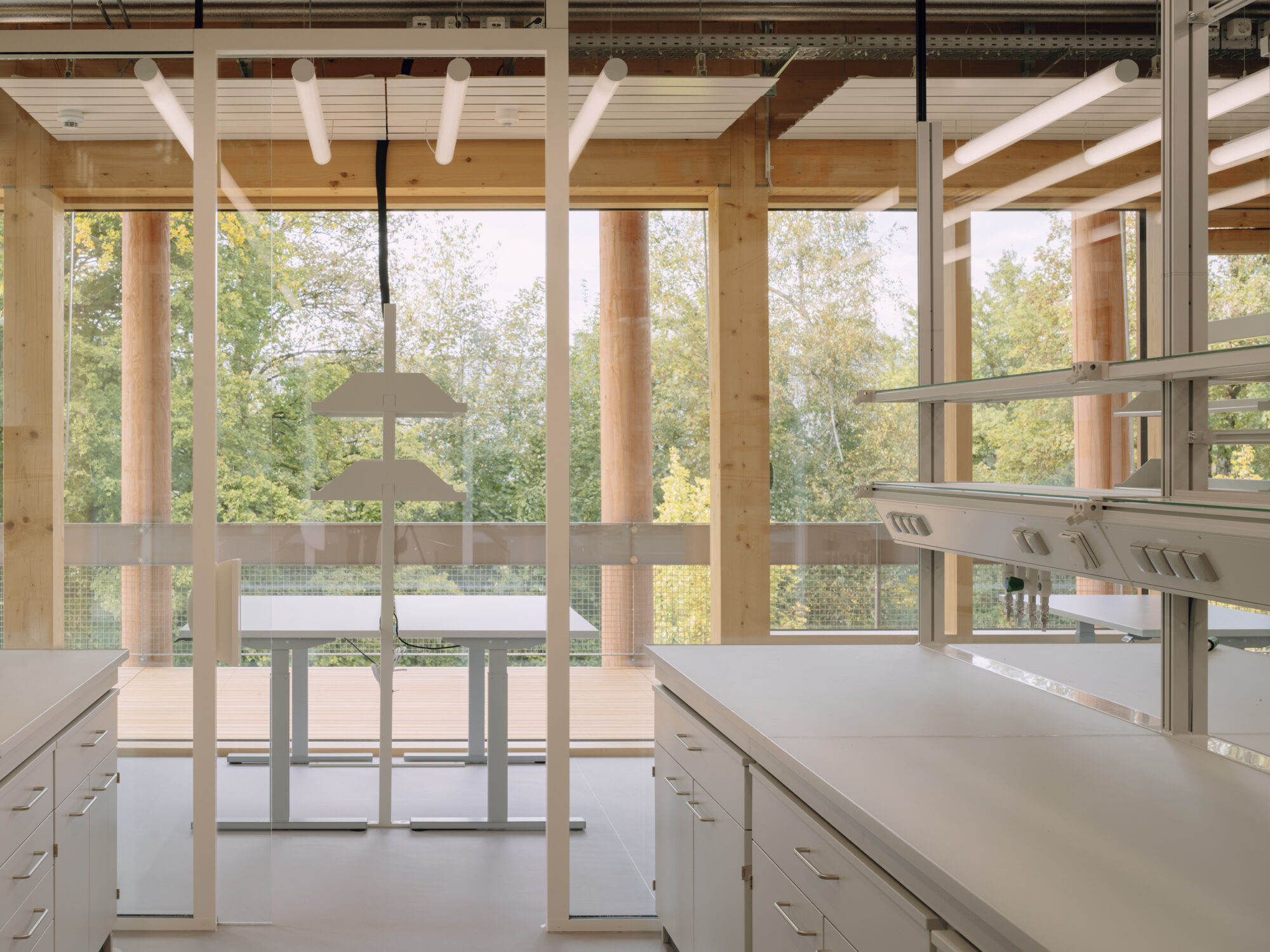 Um den Betonkern herum sind weitere Labore im 1. Obergeschoss und die Büros im Erdgeschoss konzentrisch organisiert.