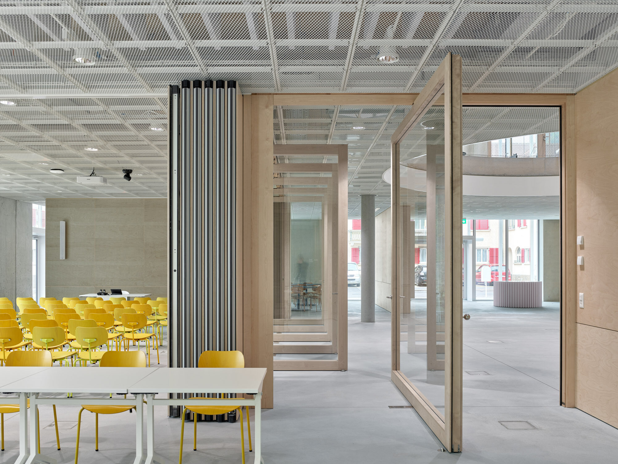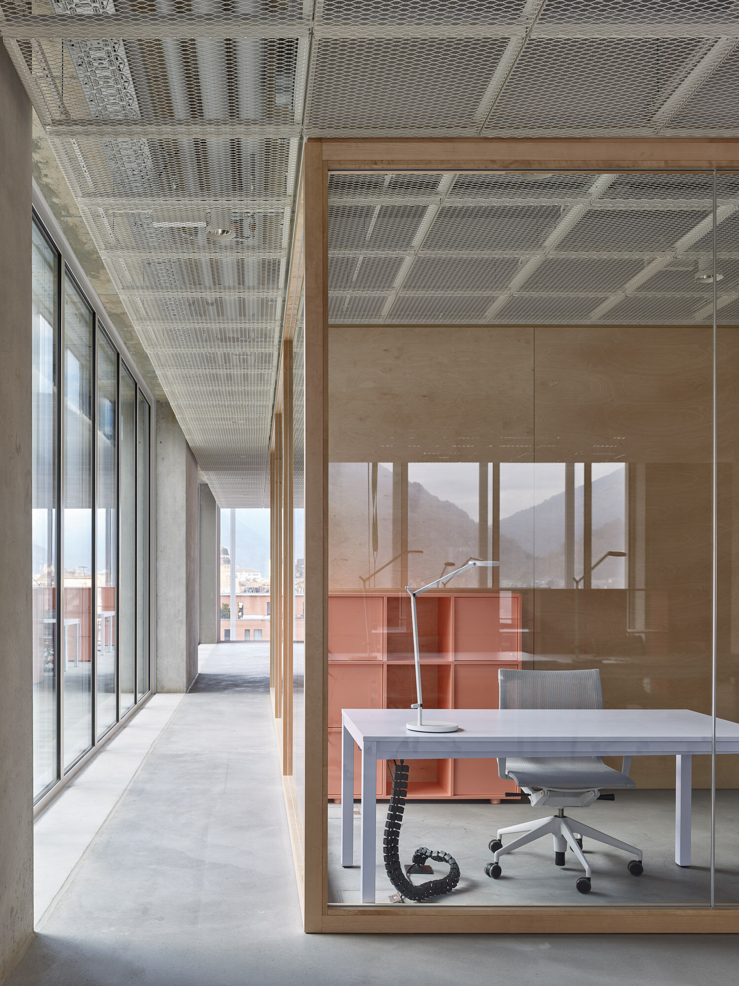 Verschiedene Zonen werden durch freistehende Wände abgegrenzt, die senkrecht zu den verglasten Fassaden stehen. Die Aufzüge, Toiletten und Lagerräume bilden neben der Treppe eine freistehende Struktur.