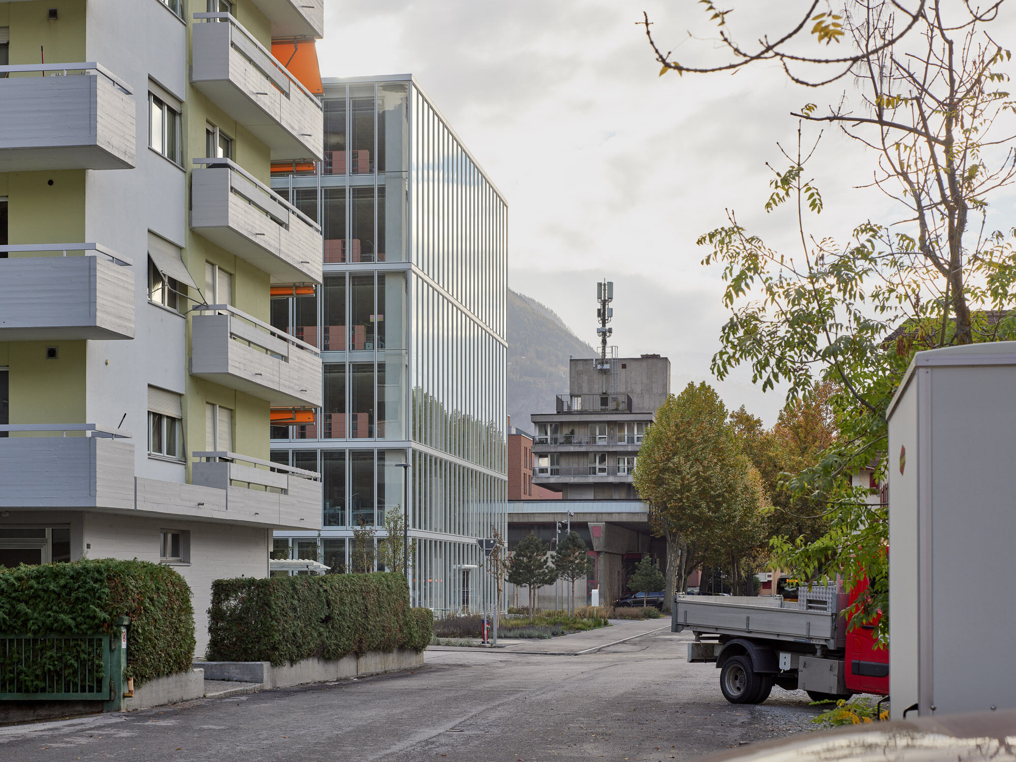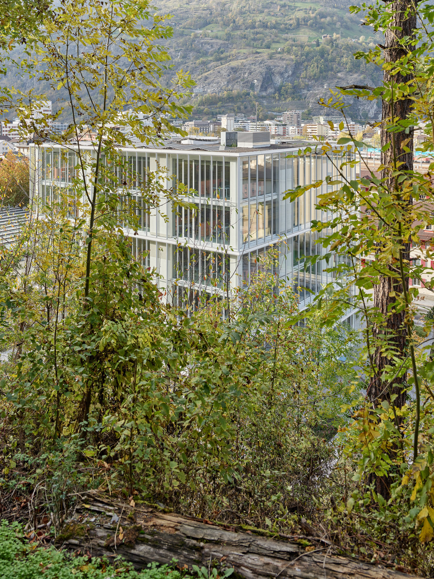 Das Erscheinungsbild des Gebäudes wird durch die markanten vertikalen Betonflächen an den Fassaden und den feinen Schleier der äusseren Glashaut bestimmt, die beide die innere Struktur betonen.