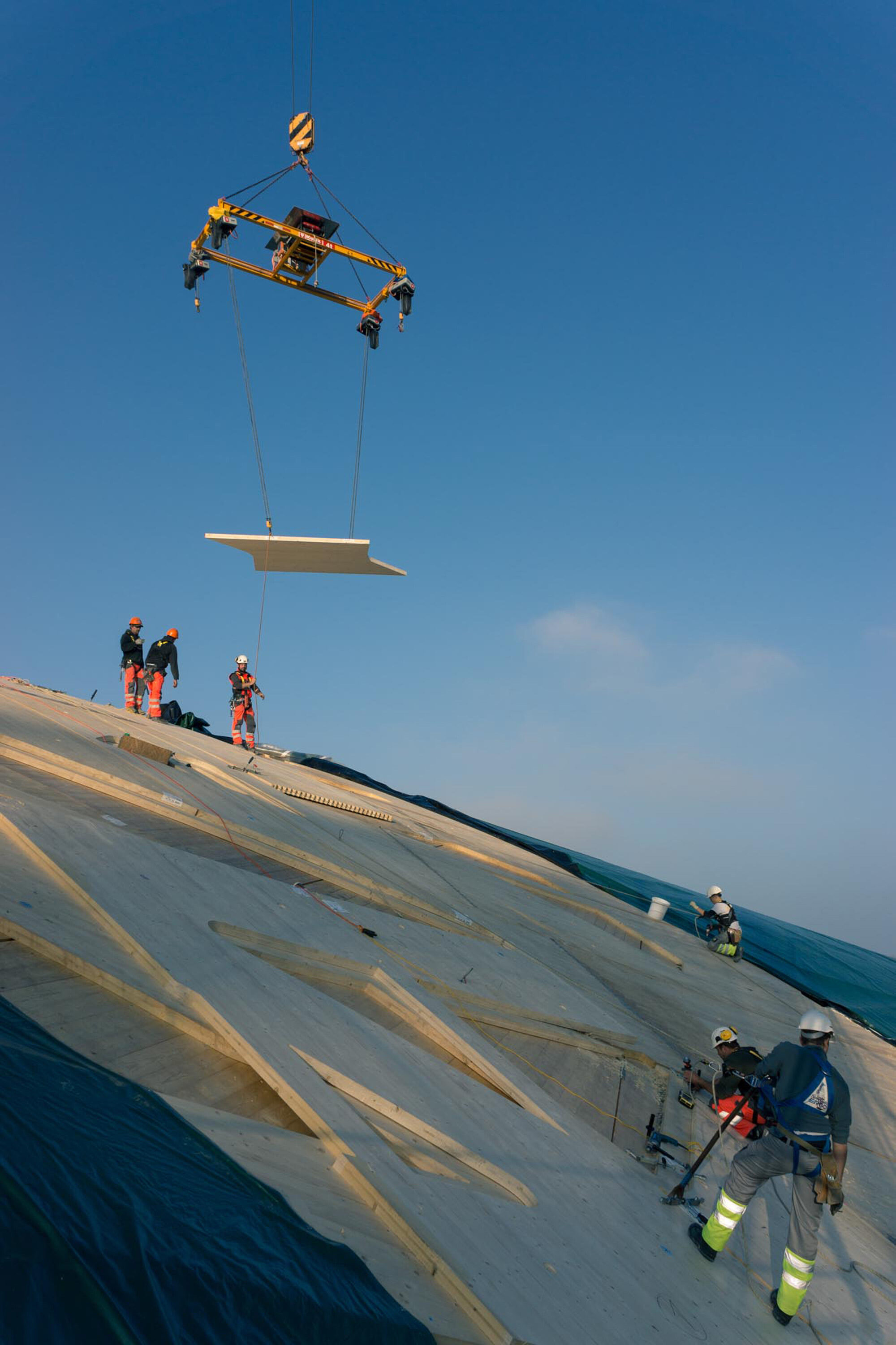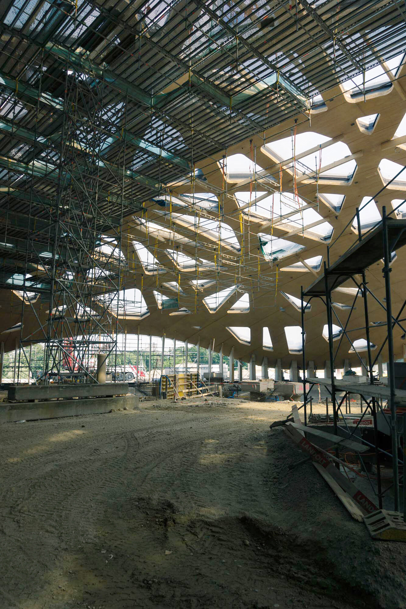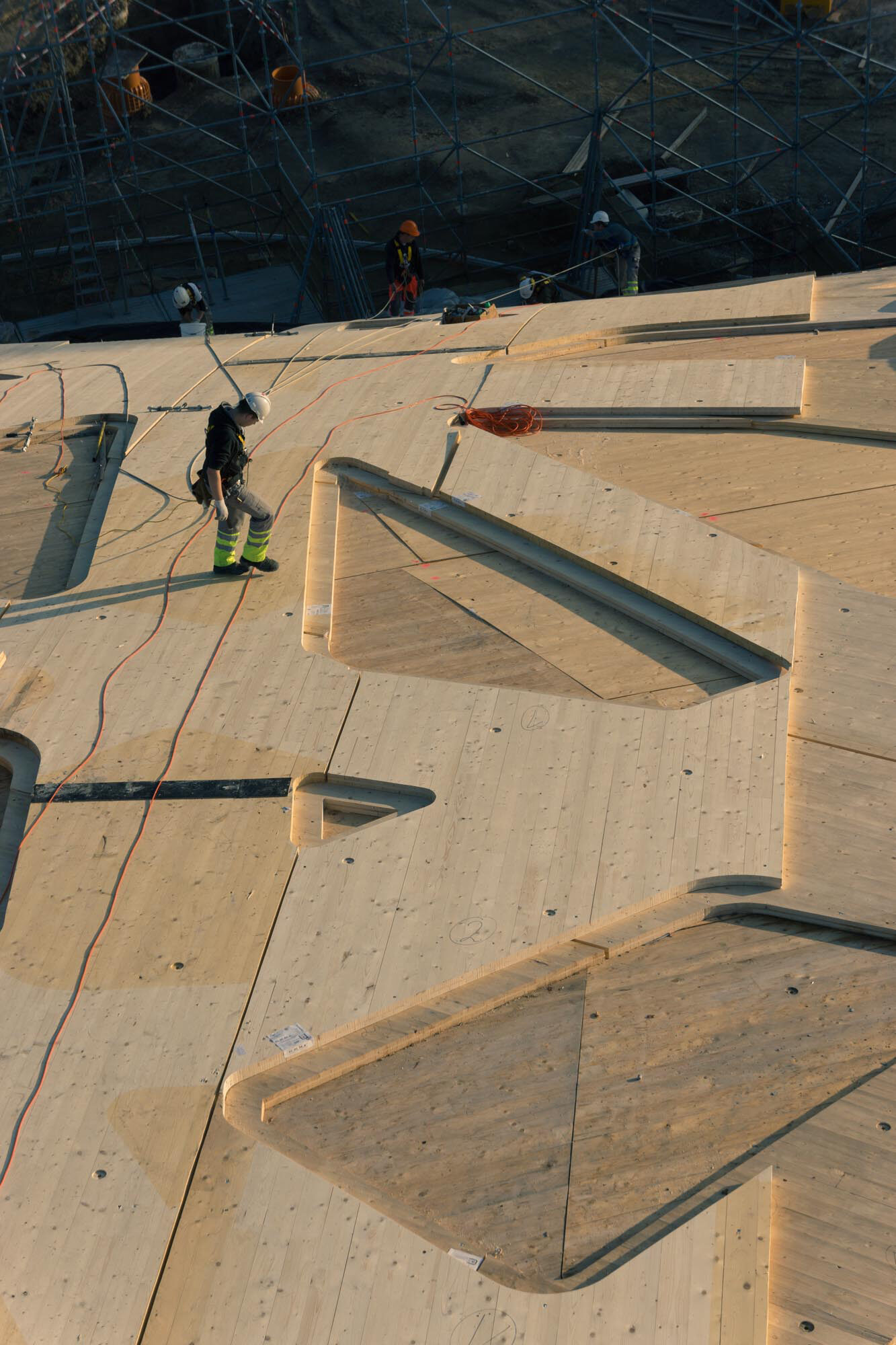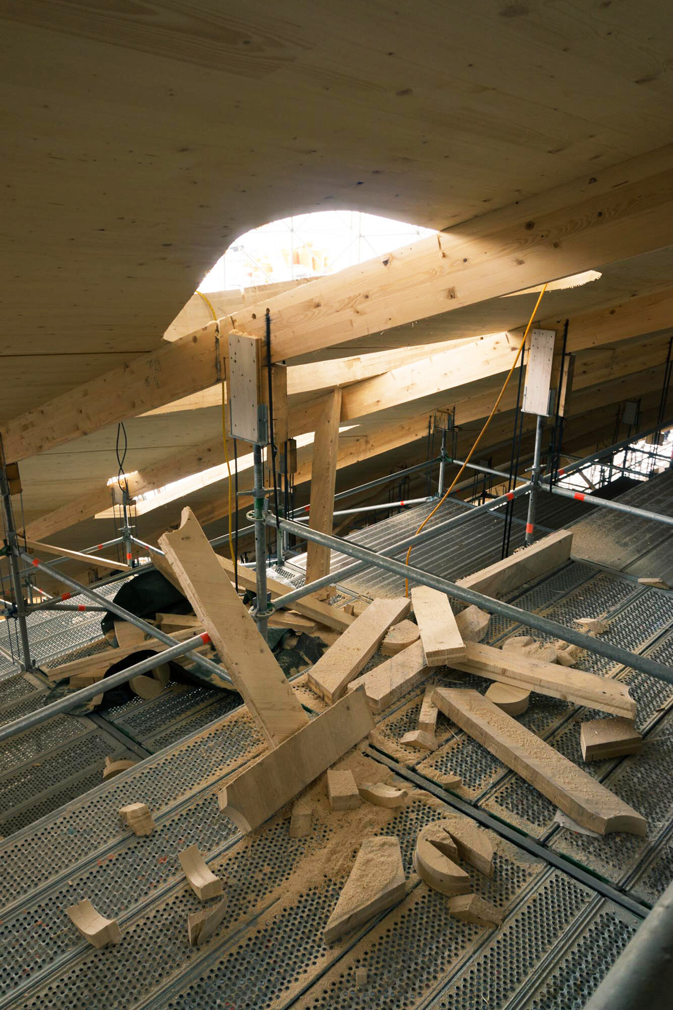 The panels of the first layer were curved over a formwork, while the panels of the second and third layer were nailed over it and rotated by 60°. The third layer already had the 271 curved cut-out shapes of the openings, which were later cut into the roof on site. Constructing the roof was like building an ark. Rather than high tech machinery, handcraft and sheer human power were needed to realise the unconventional shape.