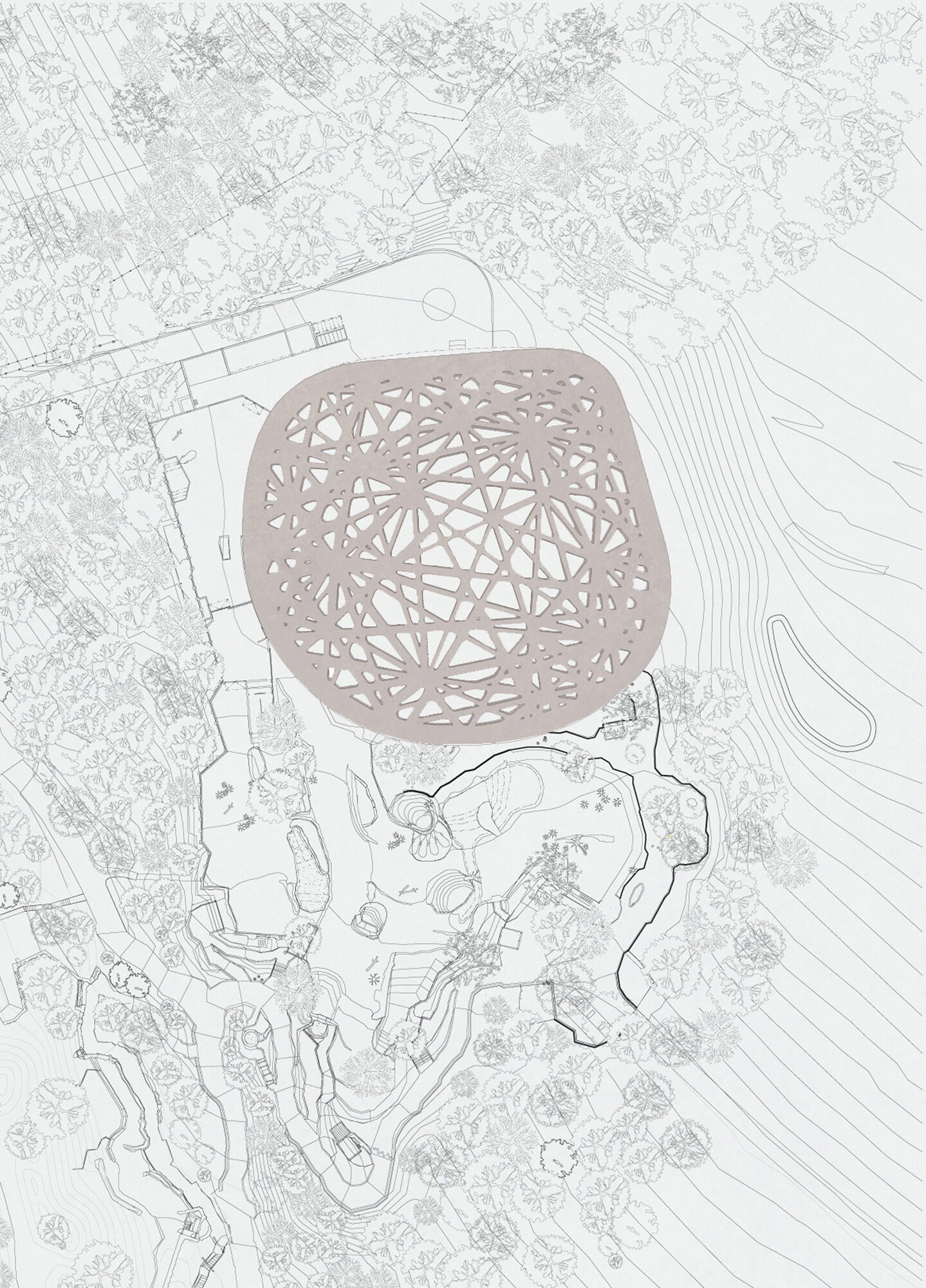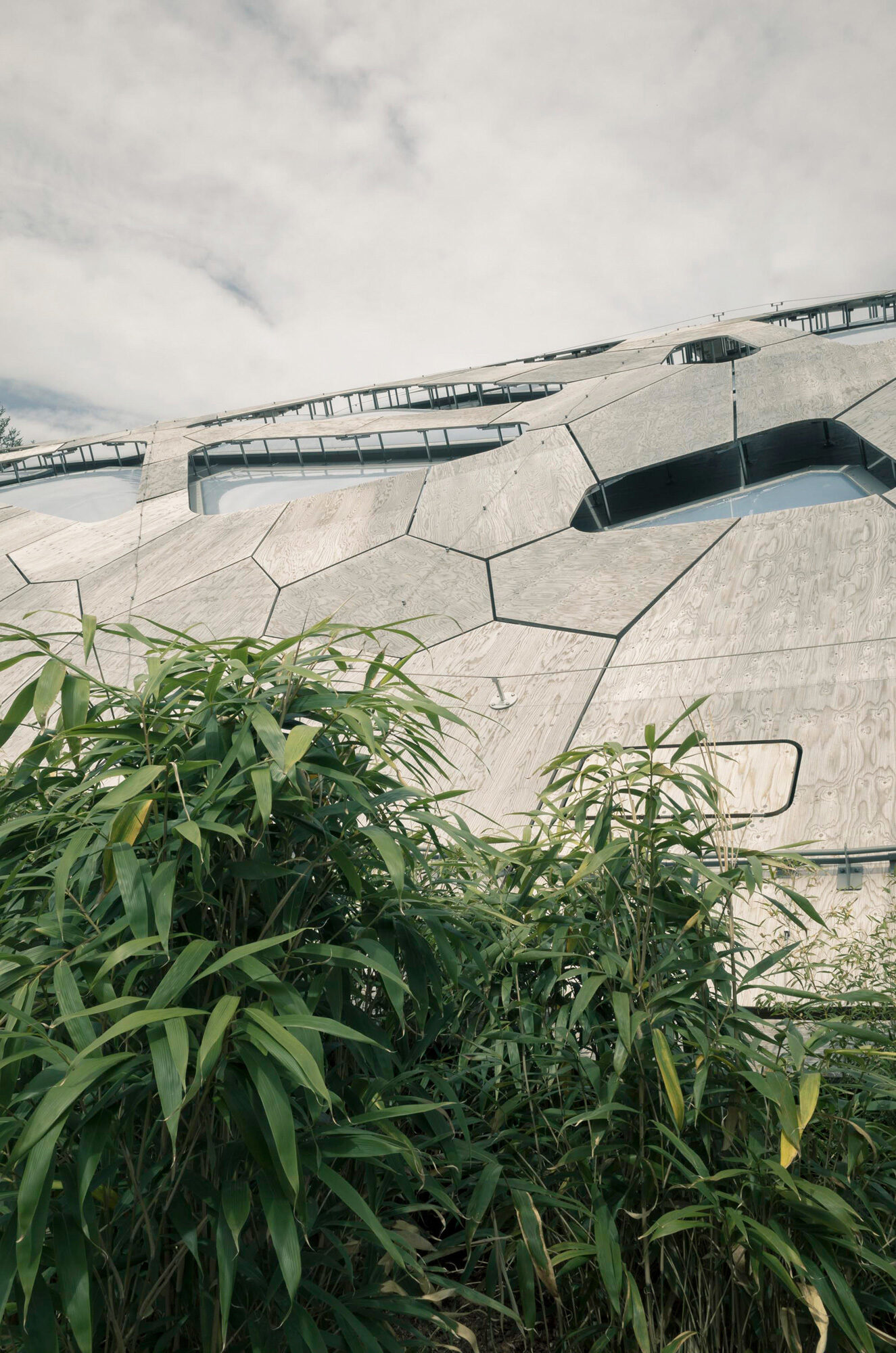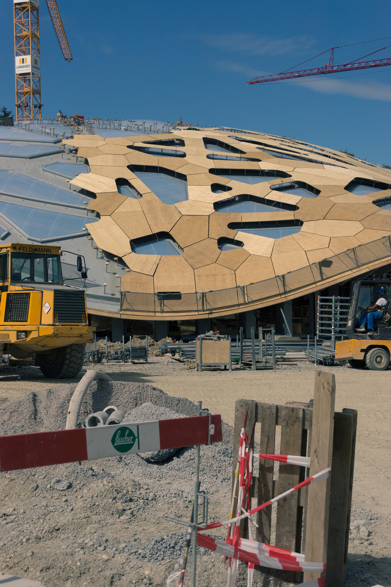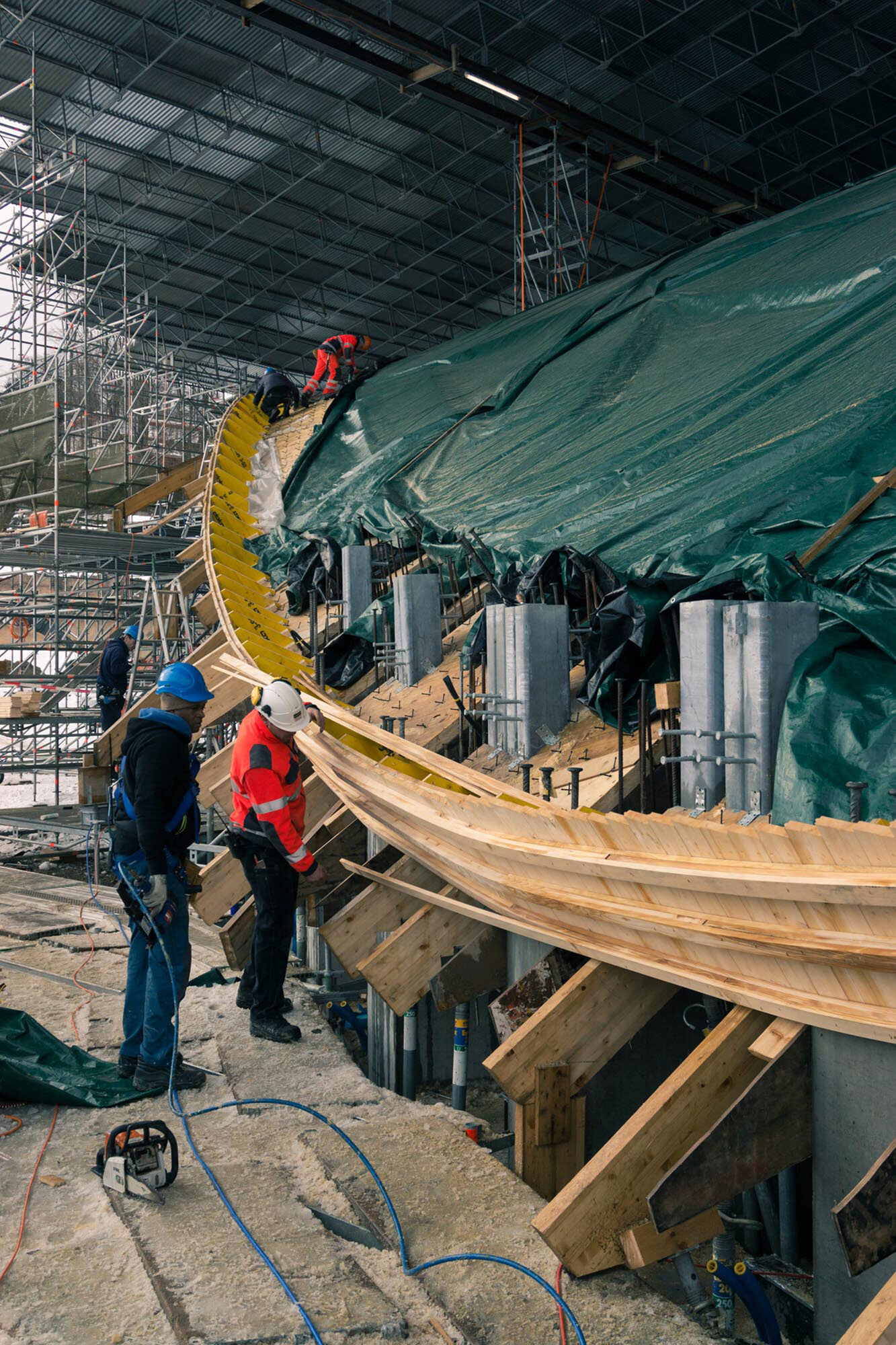 The panels of the first layer were curved over a formwork, while the panels of the second and third layer were nailed over it and rotated by 60°. The third layer already had the 271 curved cut-out shapes of the openings, which were later cut into the roof on site. Constructing the roof was like building an ark. Rather than high tech machinery, handcraft and sheer human power were needed to realise the unconventional shape.