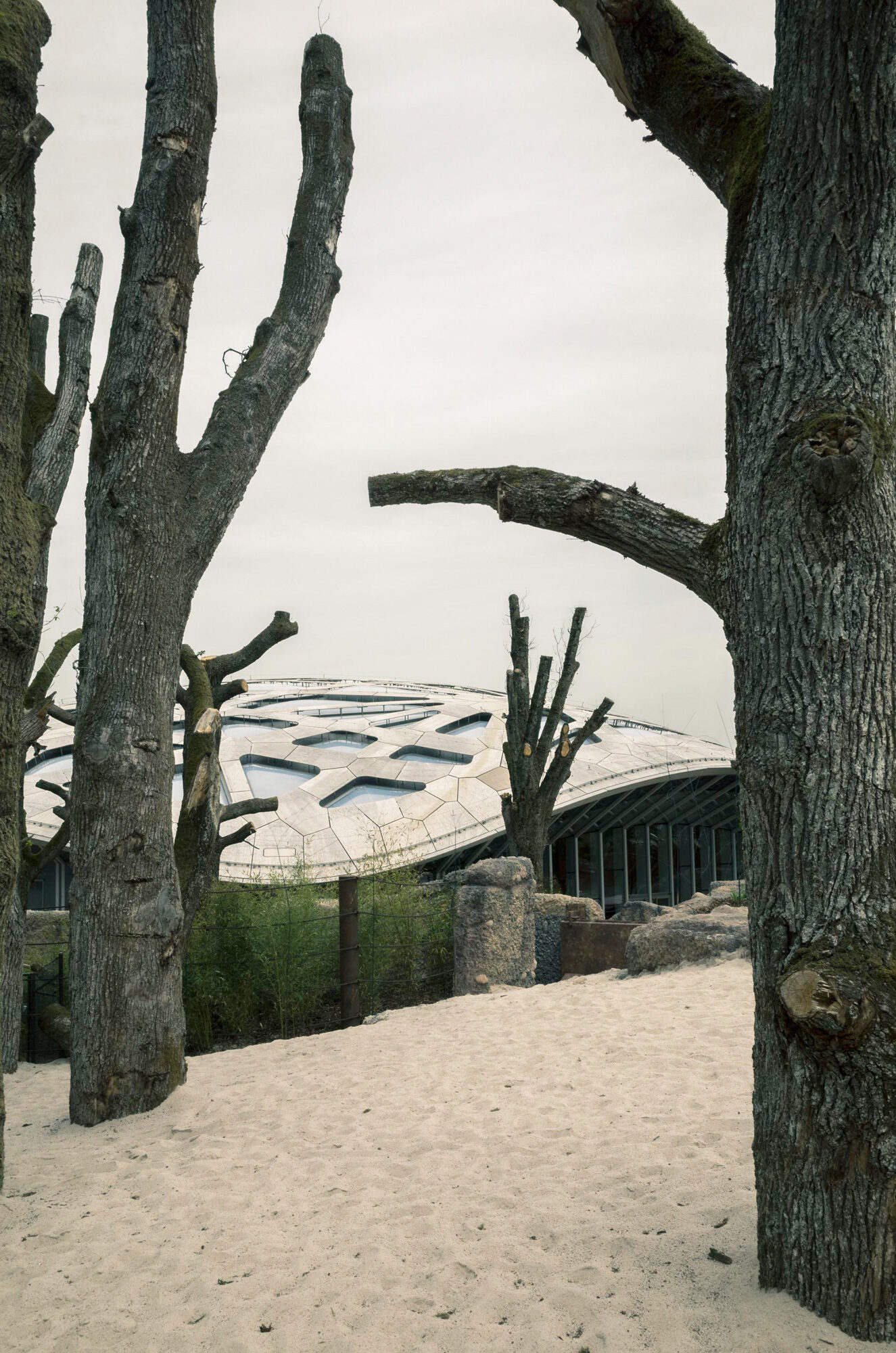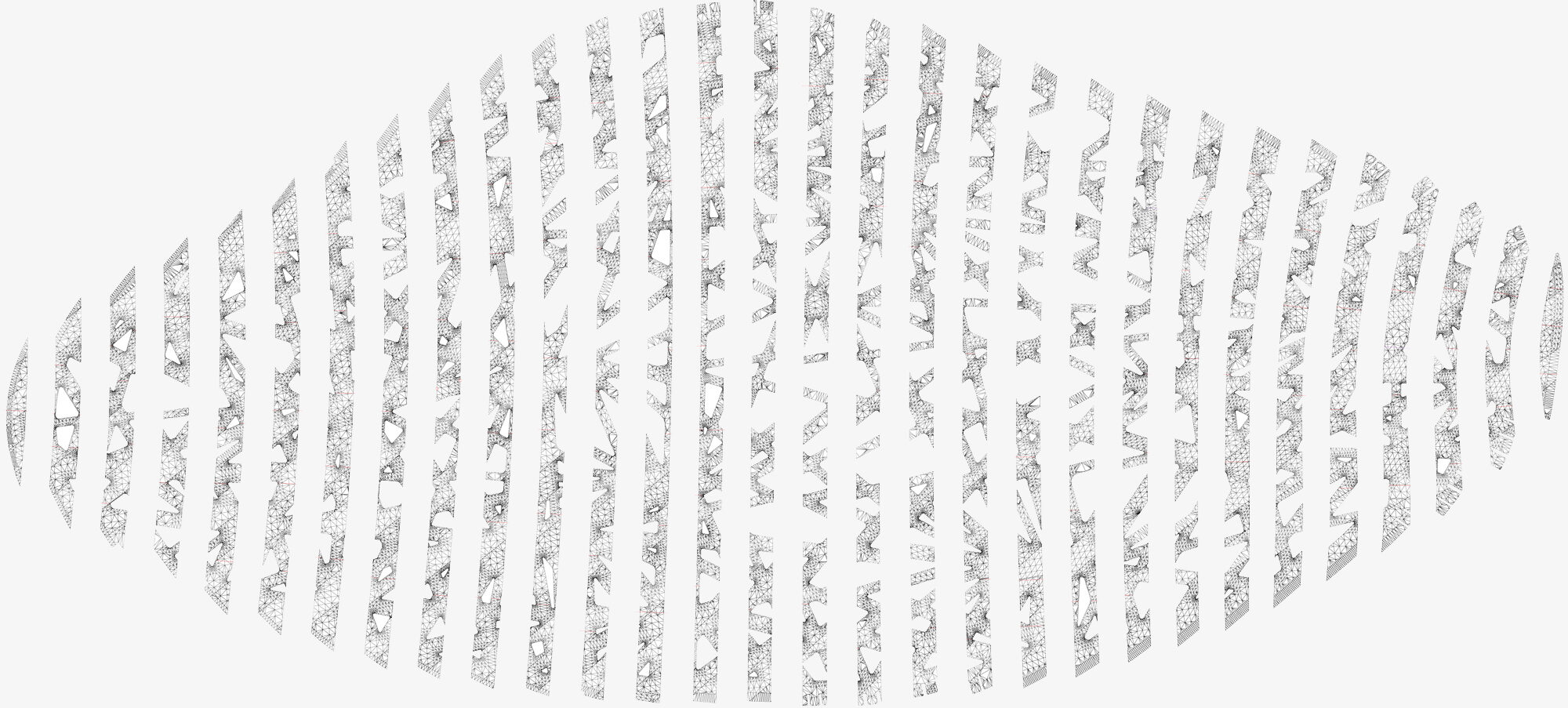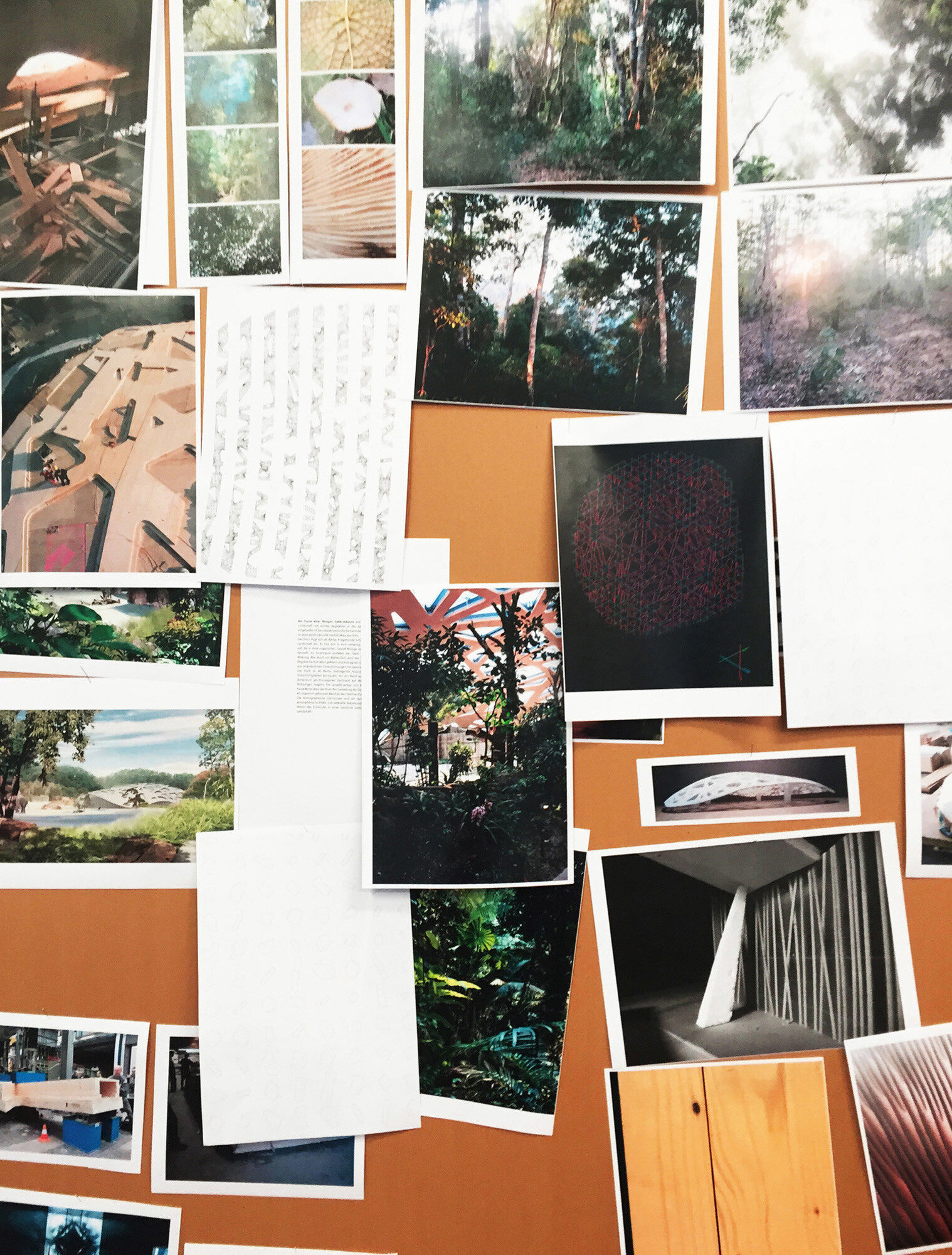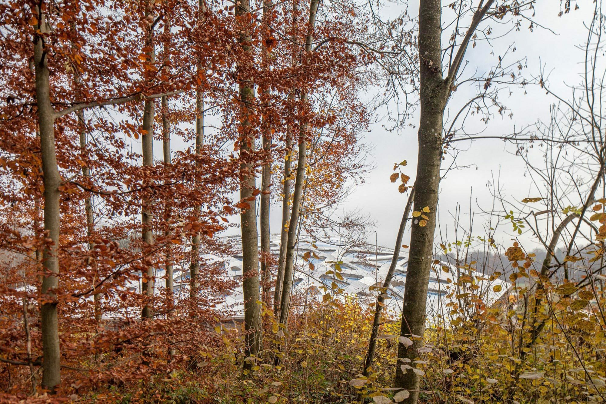 The panels of the first layer were curved over a formwork, while the panels of the second and third layer were nailed over it and rotated by 60°. The third layer already had the 271 curved cut-out shapes of the openings, which were later cut into the roof on site. Constructing the roof was like building an ark. Rather than high tech machinery, handcraft and sheer human power were needed to realise the unconventional shape.