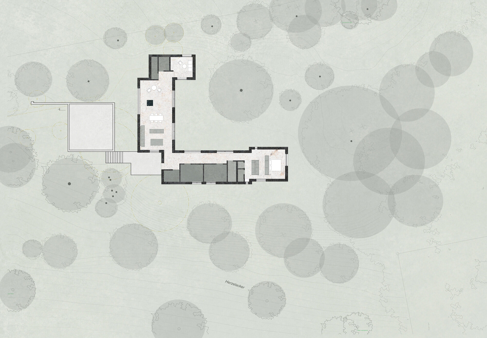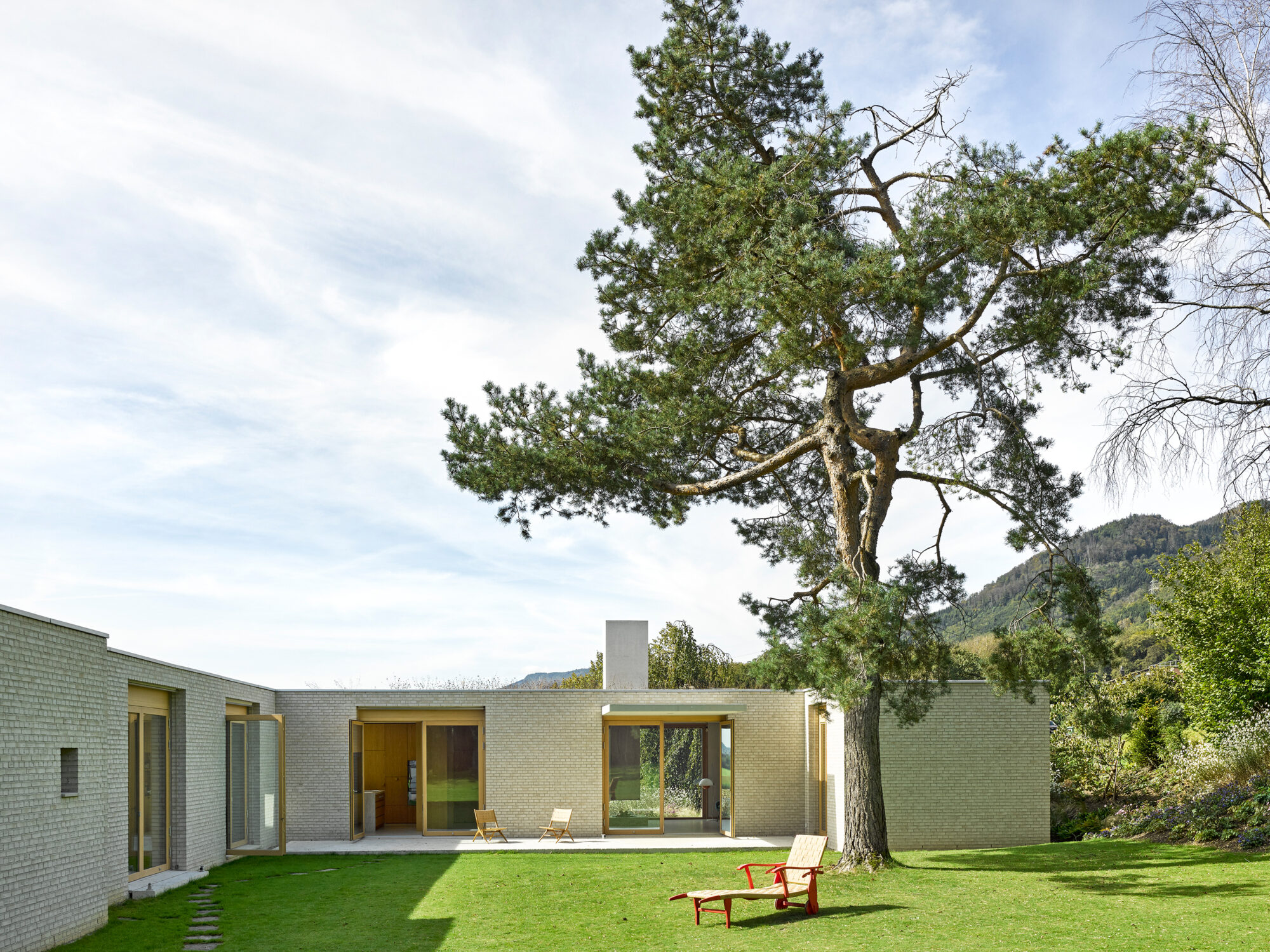 Located near Olten, the House is designed as a route around a private inner courtyard. A buffer to the busy road in the valley below is formed by the U-shaped volume that encloses an existing conifer tree.
