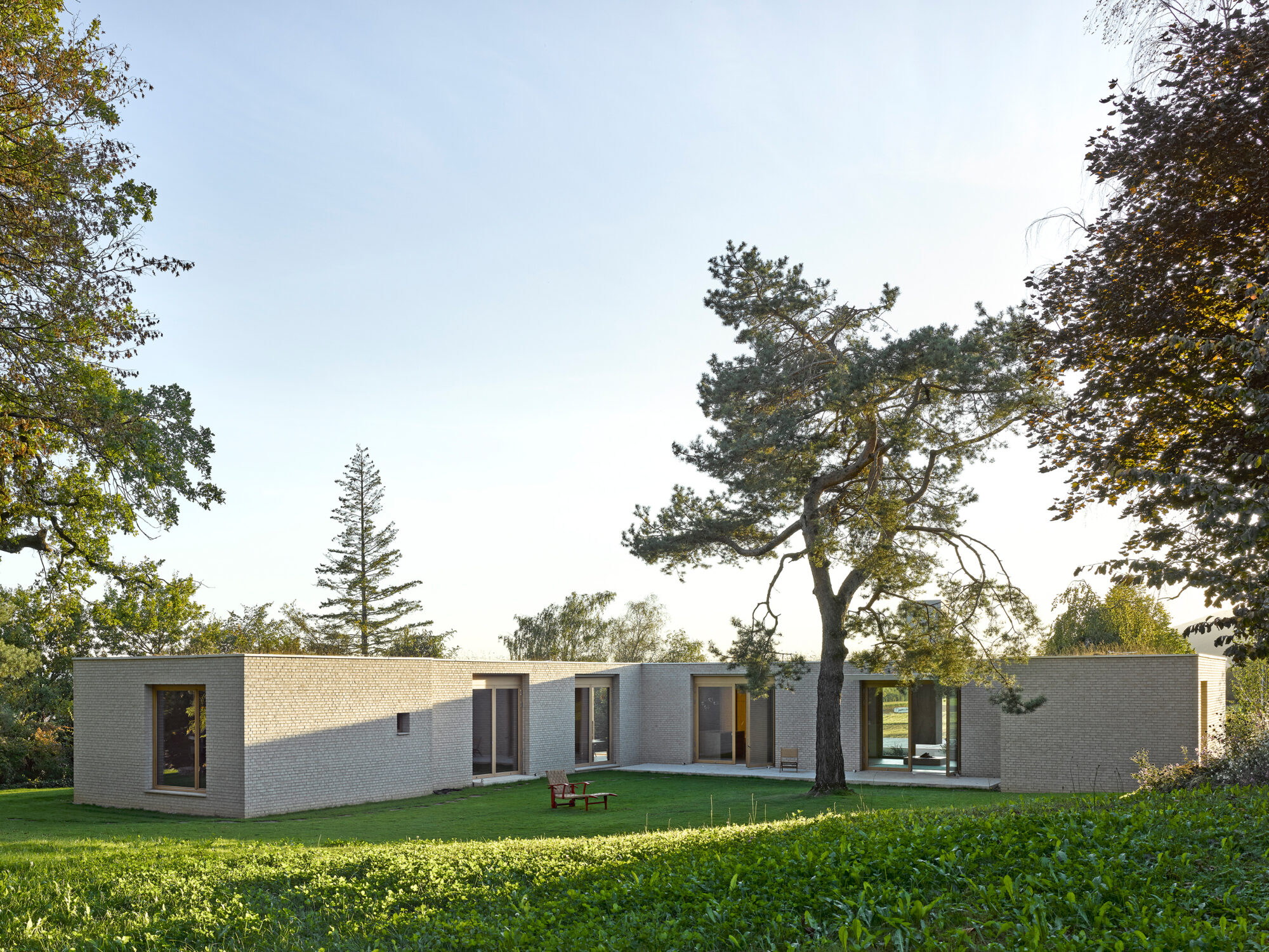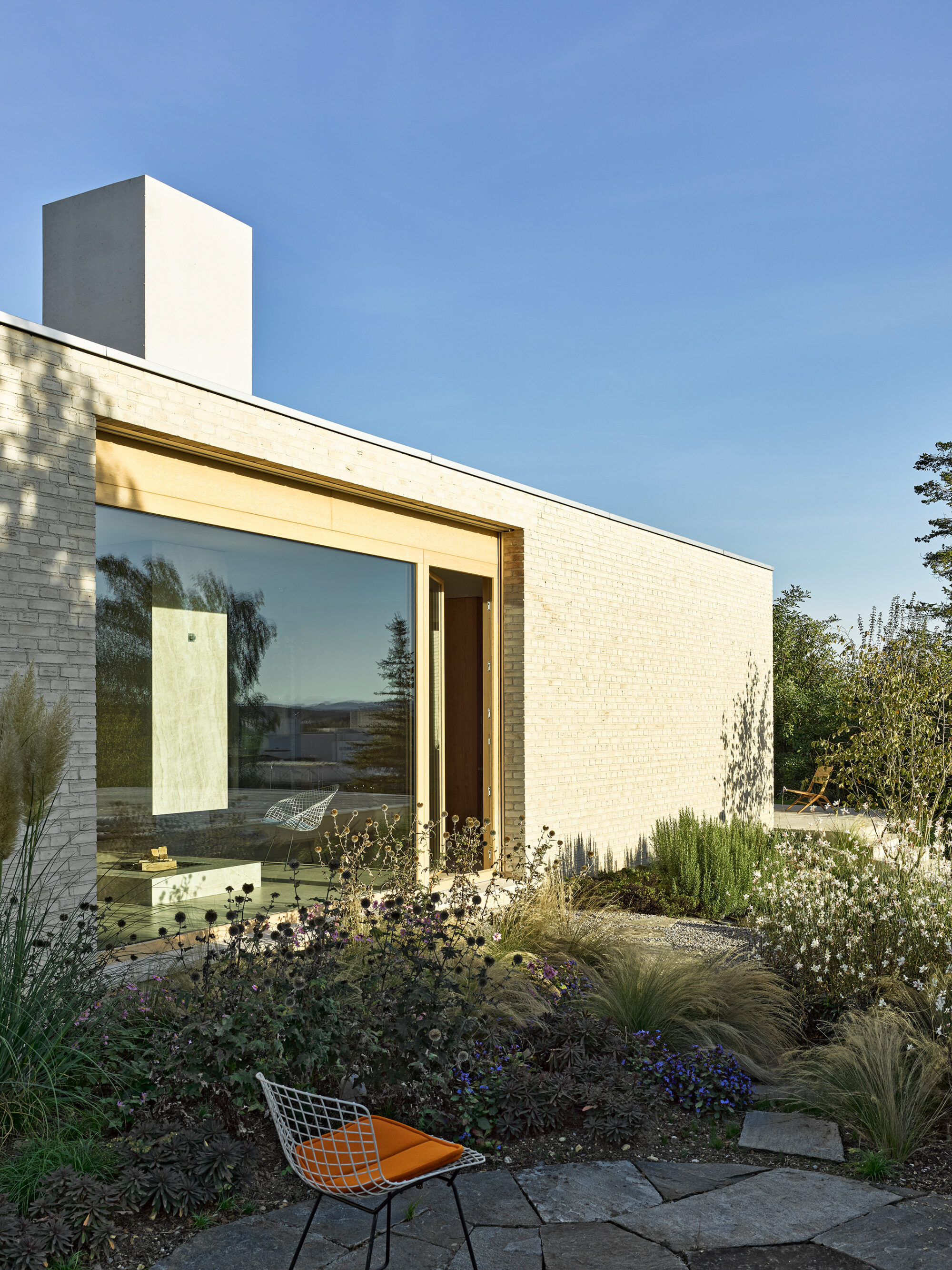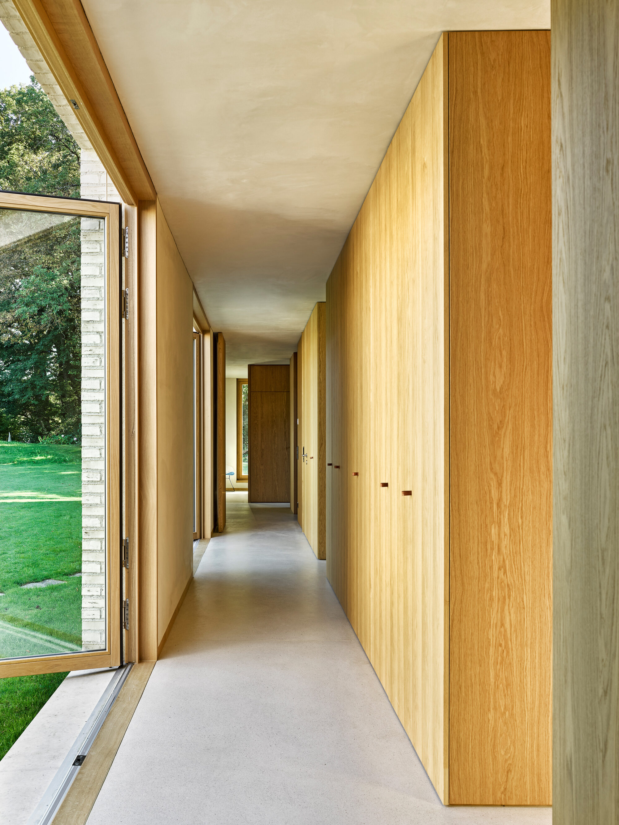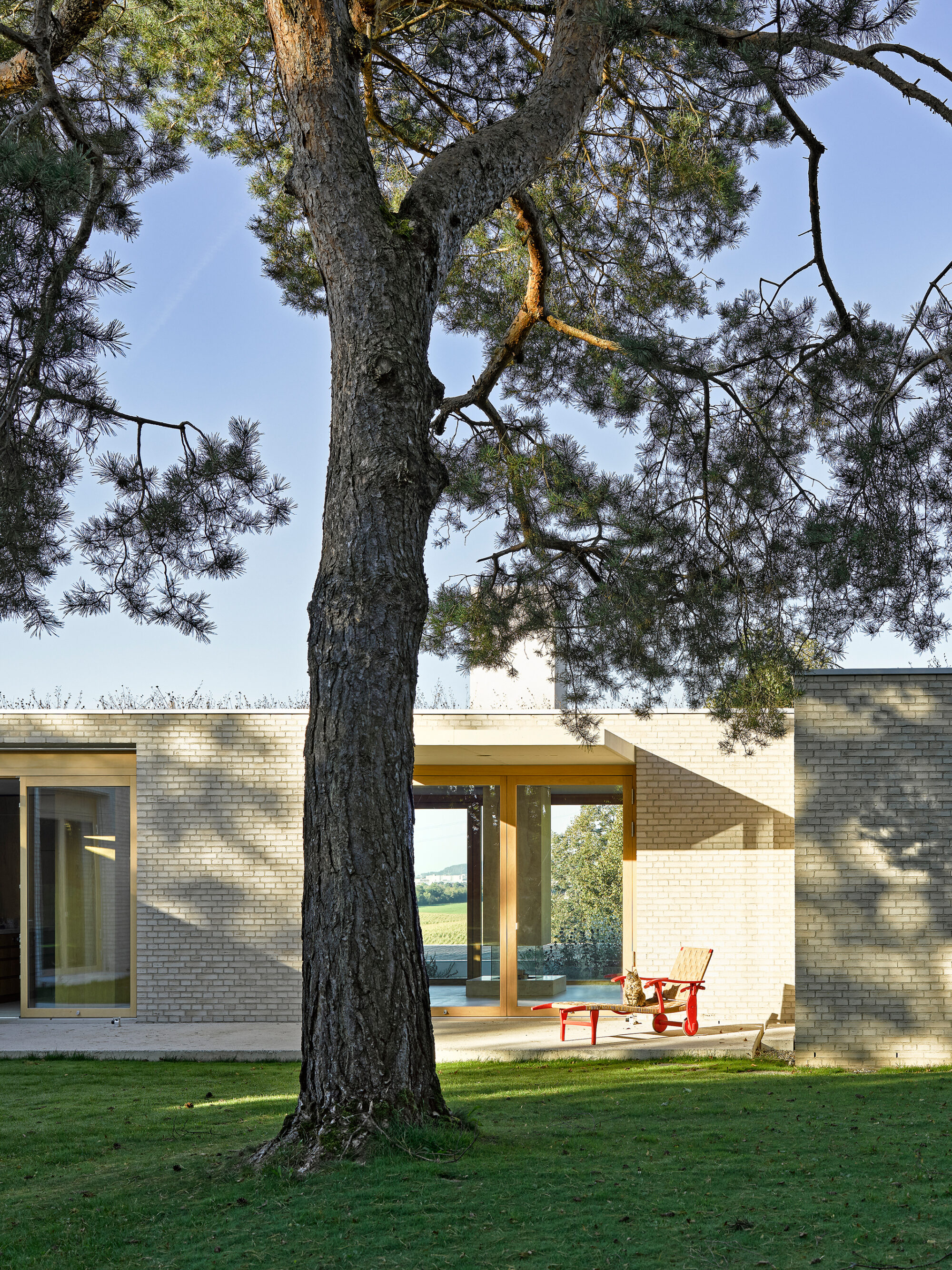 Textured planes of chalky brick on the external facades are interspersed with large oak-framed doors that open out onto the garden.