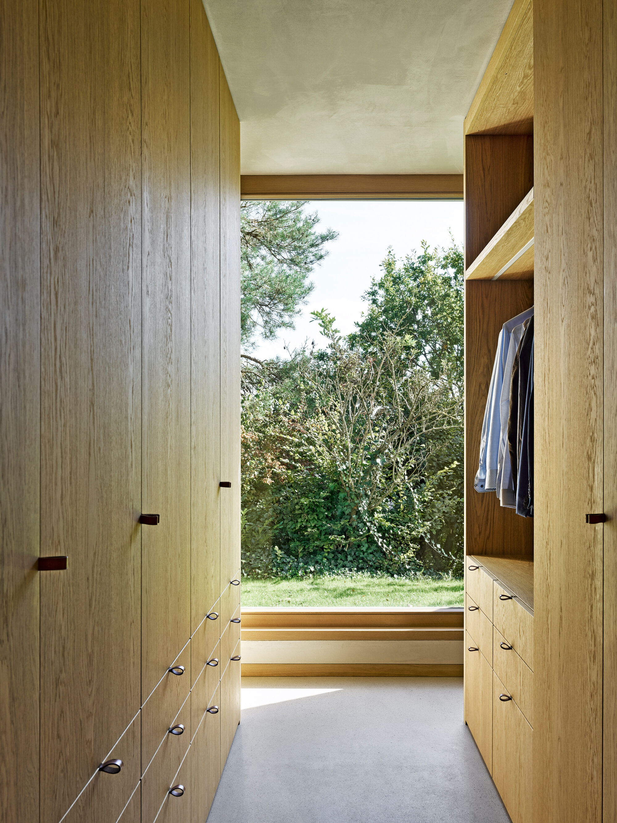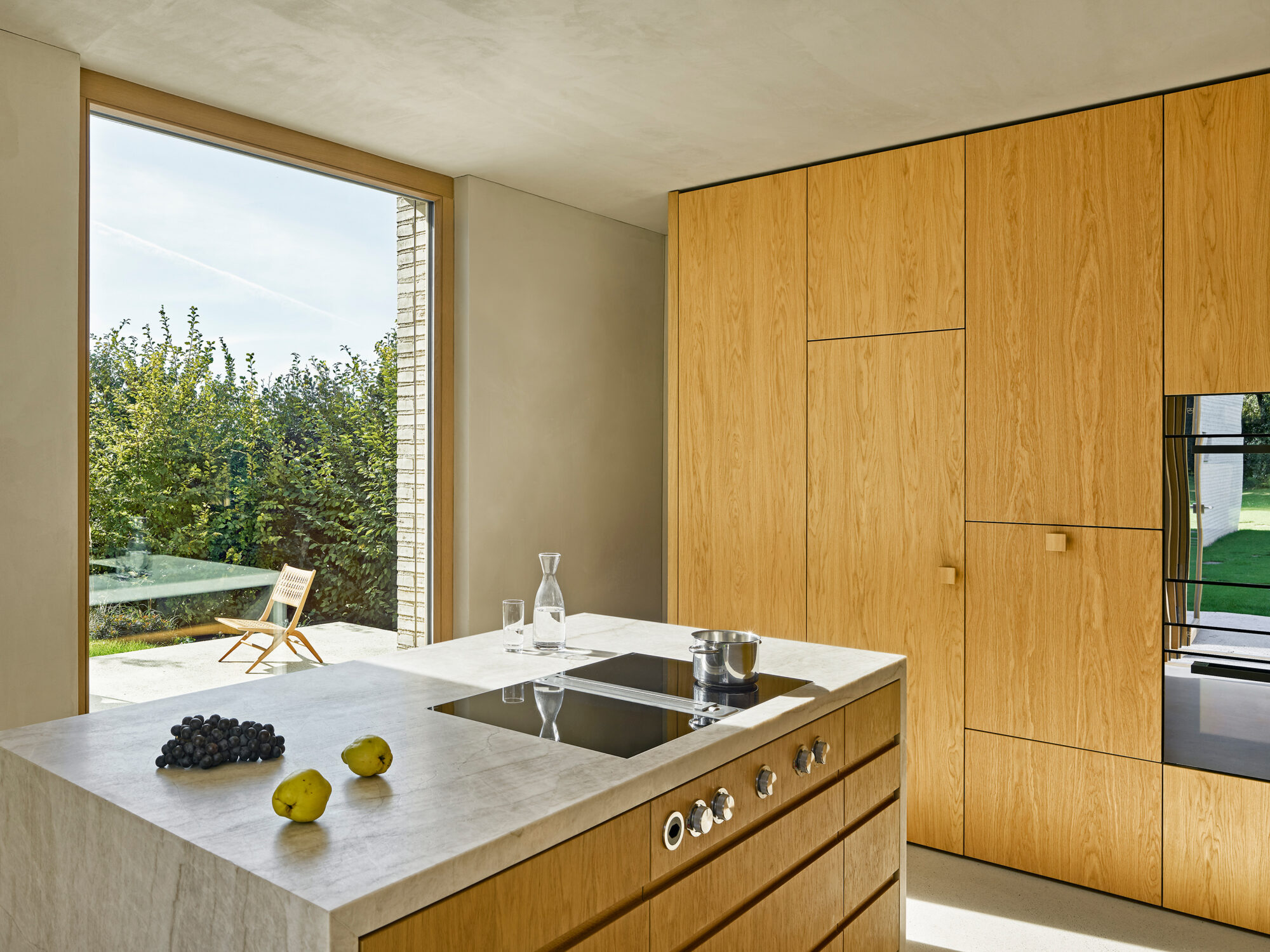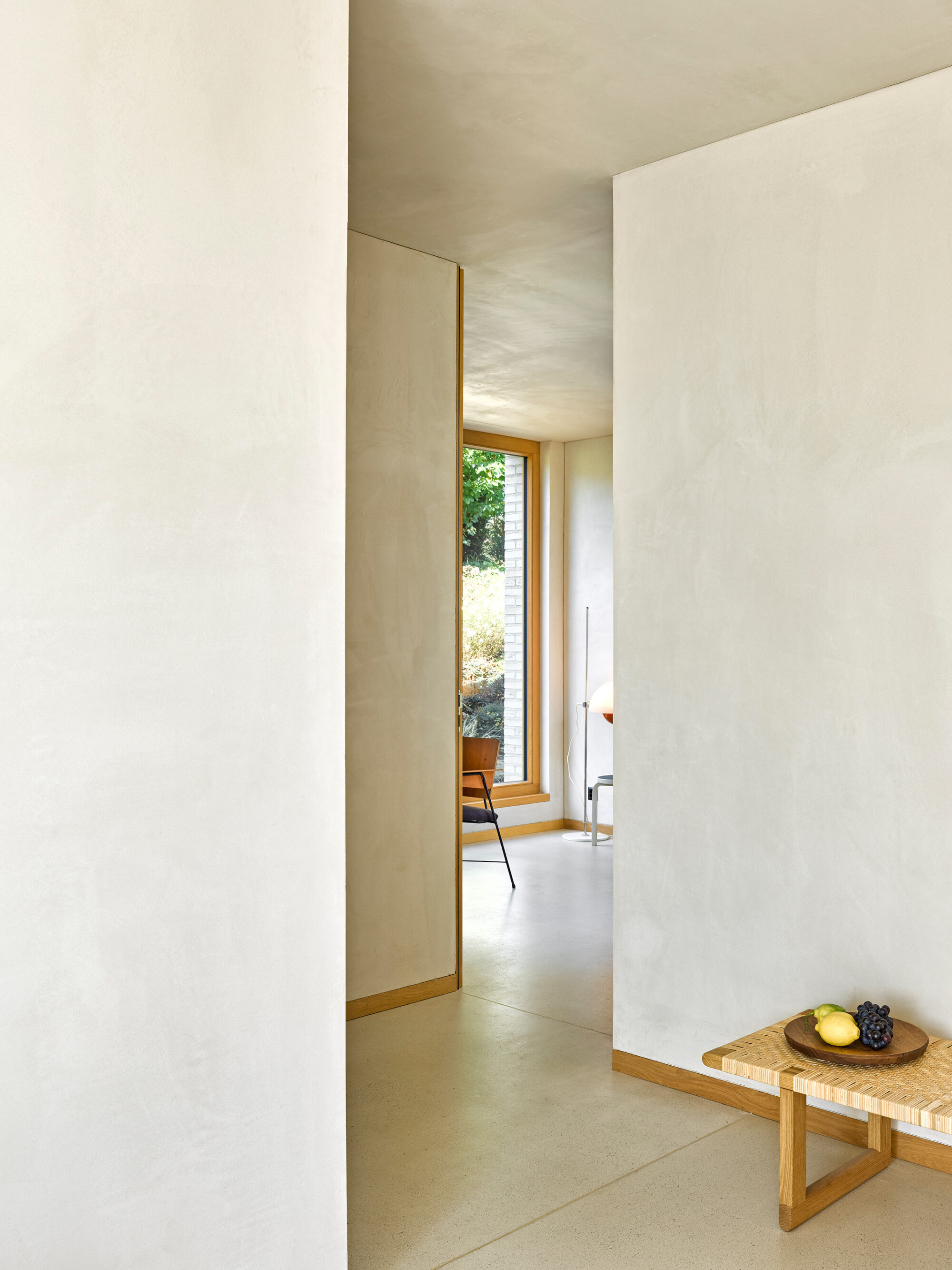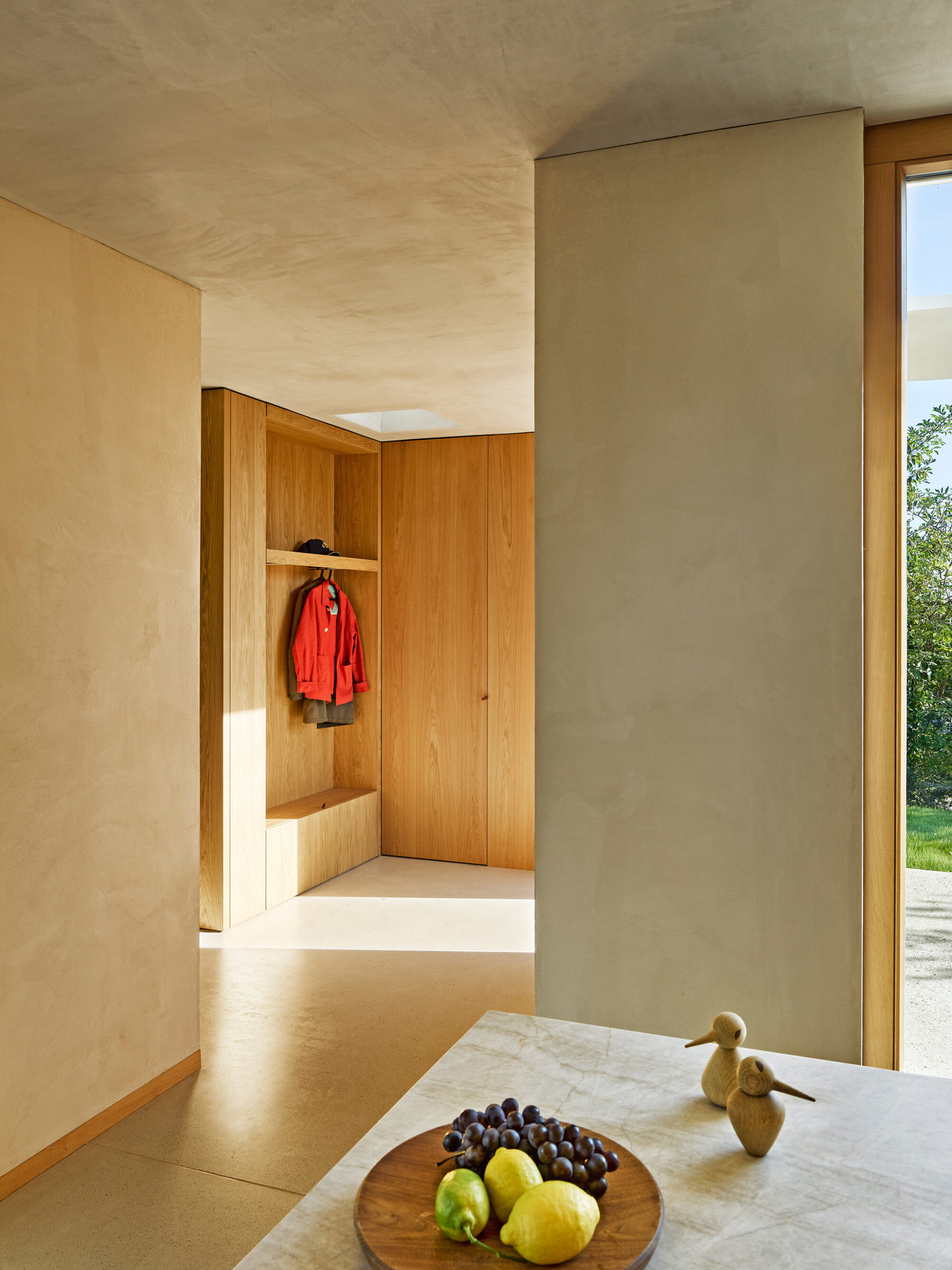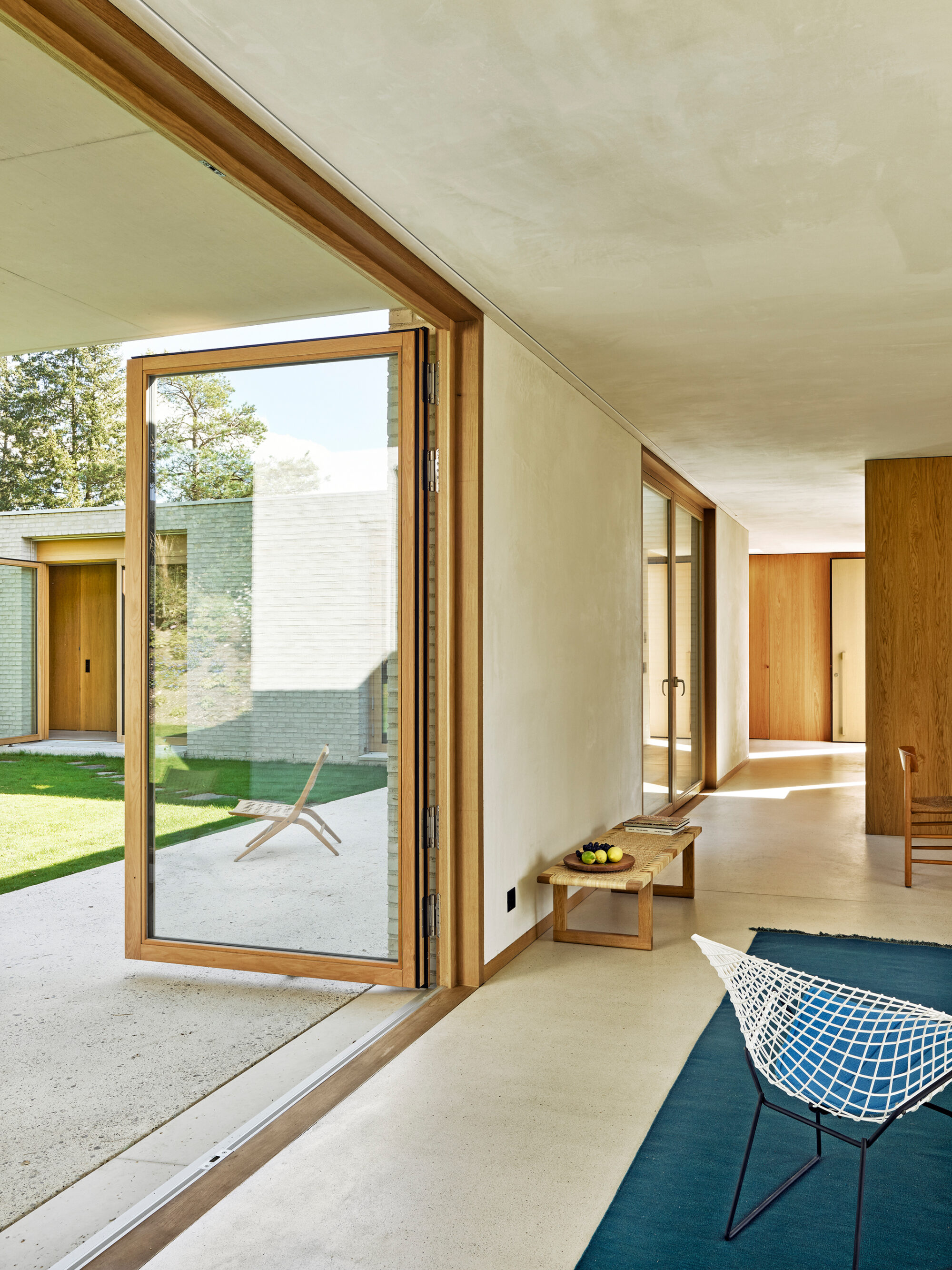 Textured planes of chalky brick on the external facades are interspersed with large oak-framed doors that open out onto the garden.