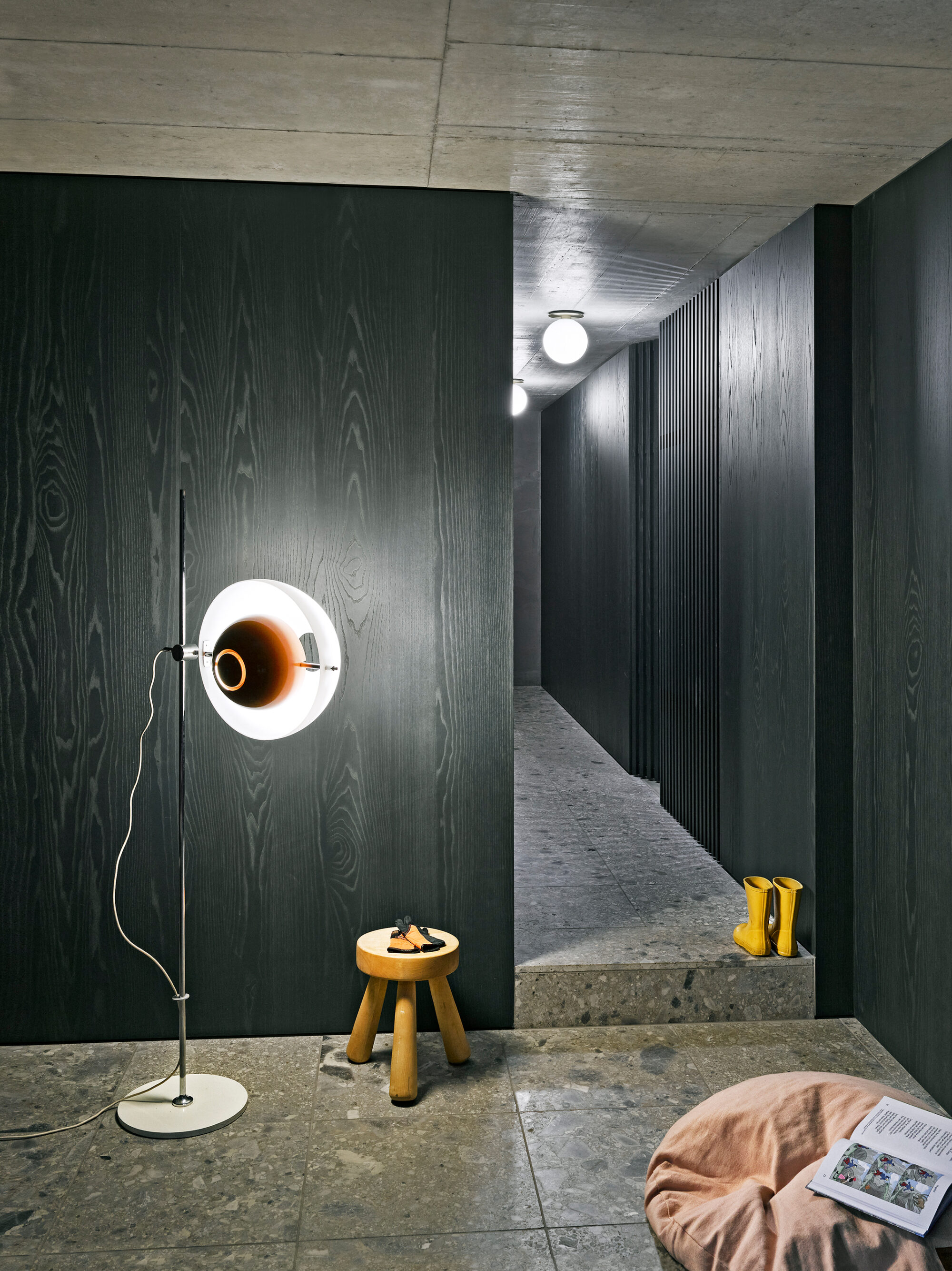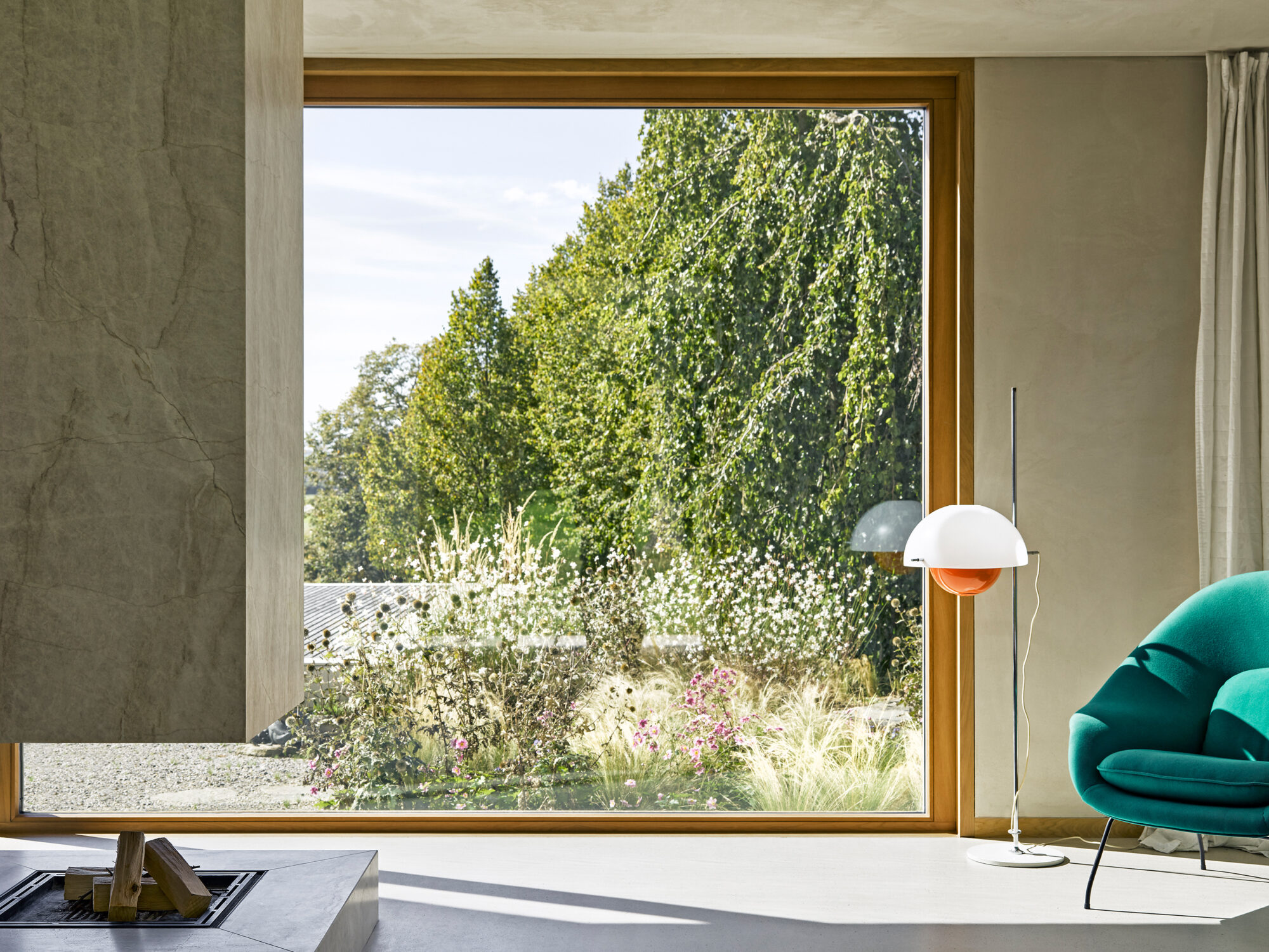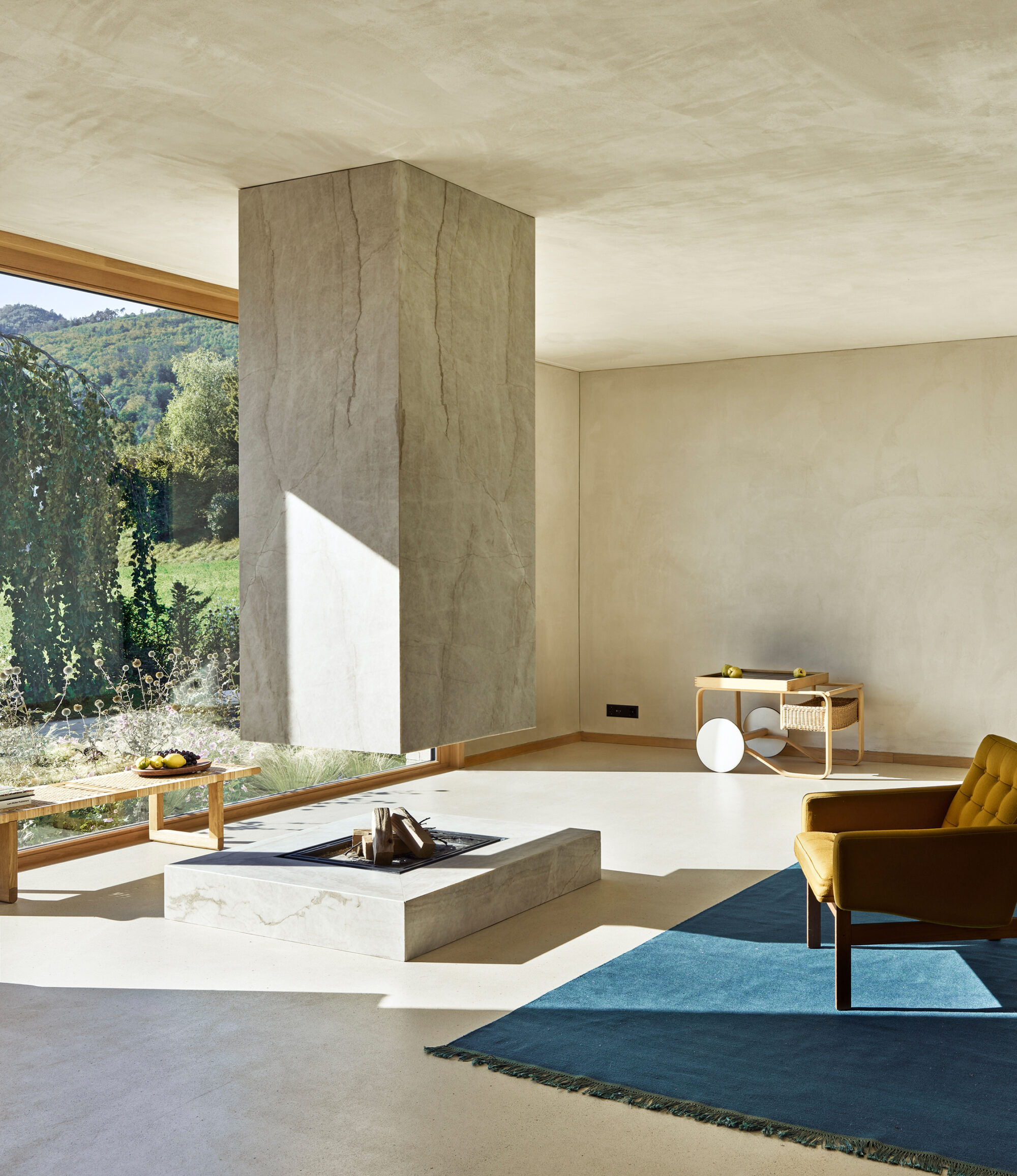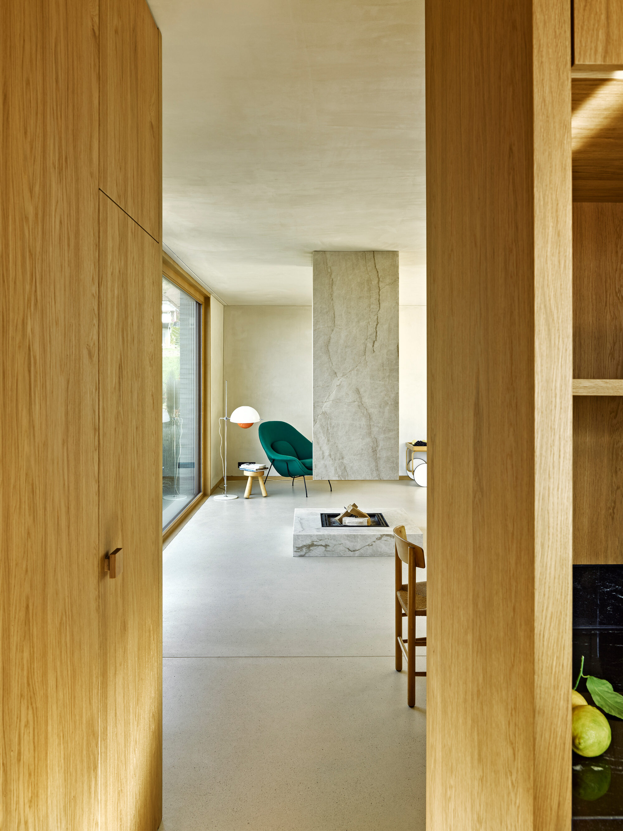 There is a freestanding hearth clad in milky granite in the communal wing, which visually separates the dining room from the living room and forms a clear vertical accent in the otherwise horizontal arrangement.