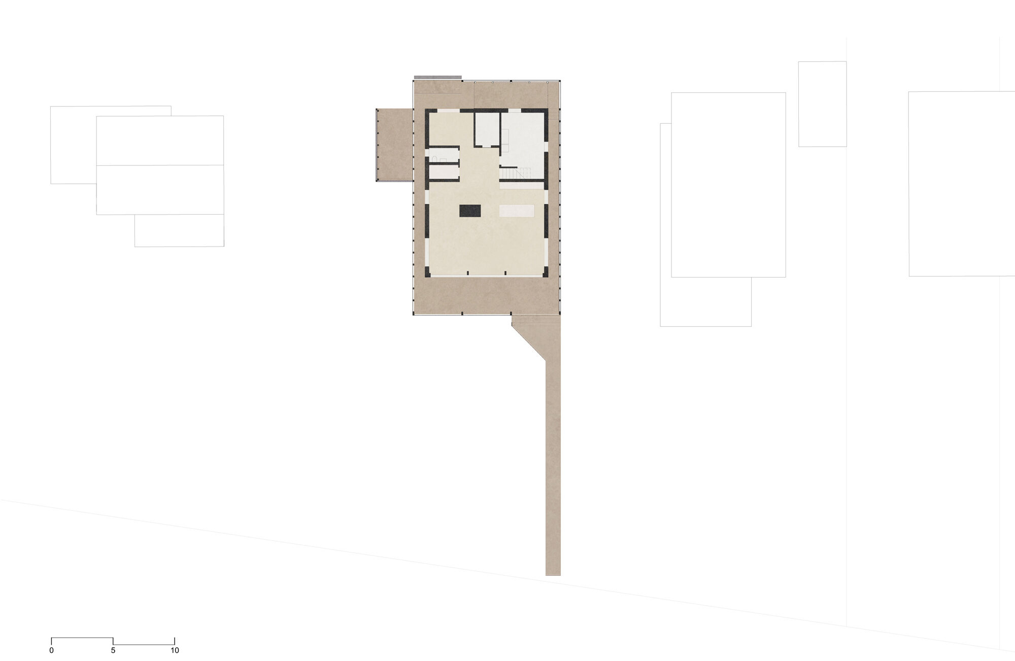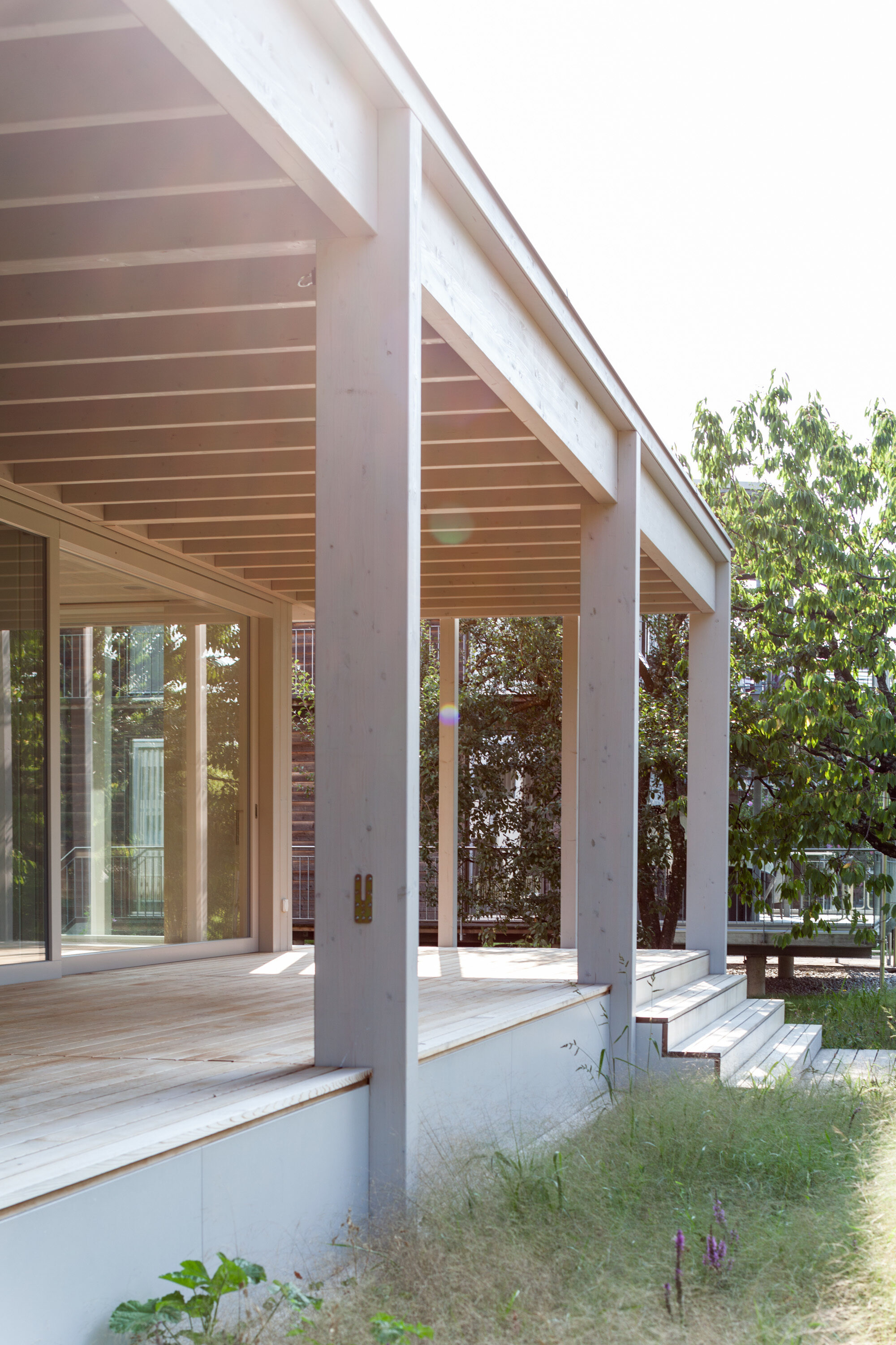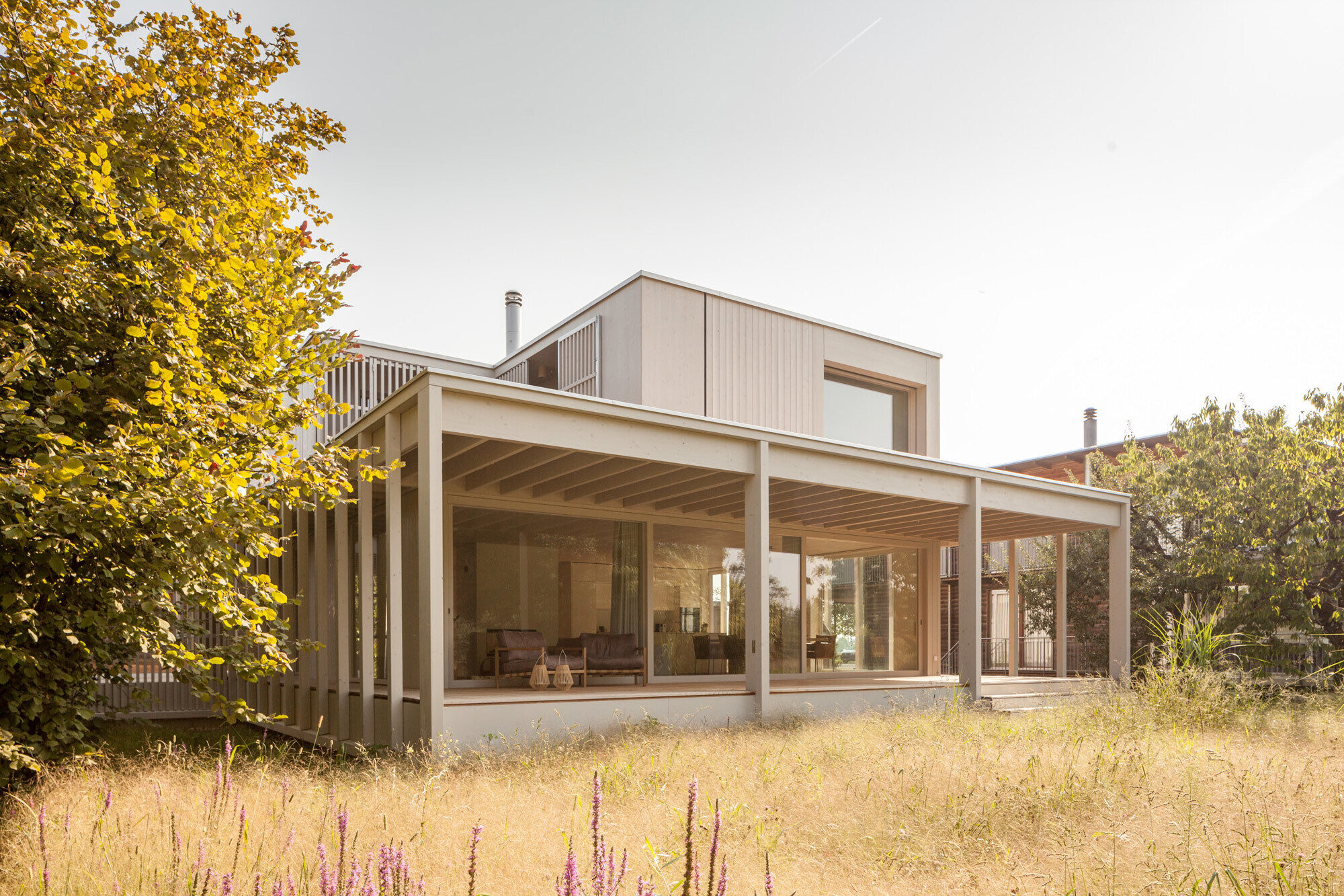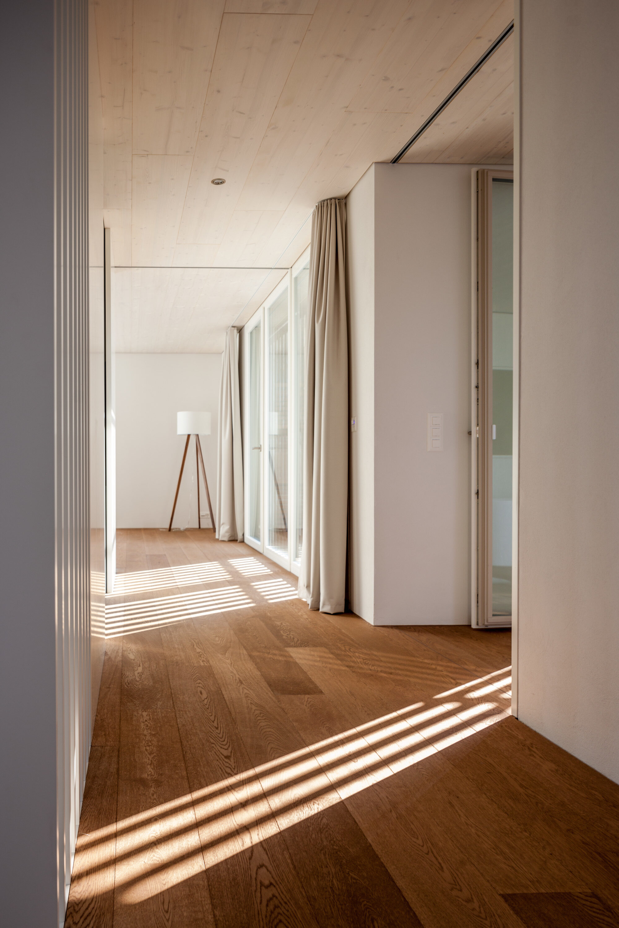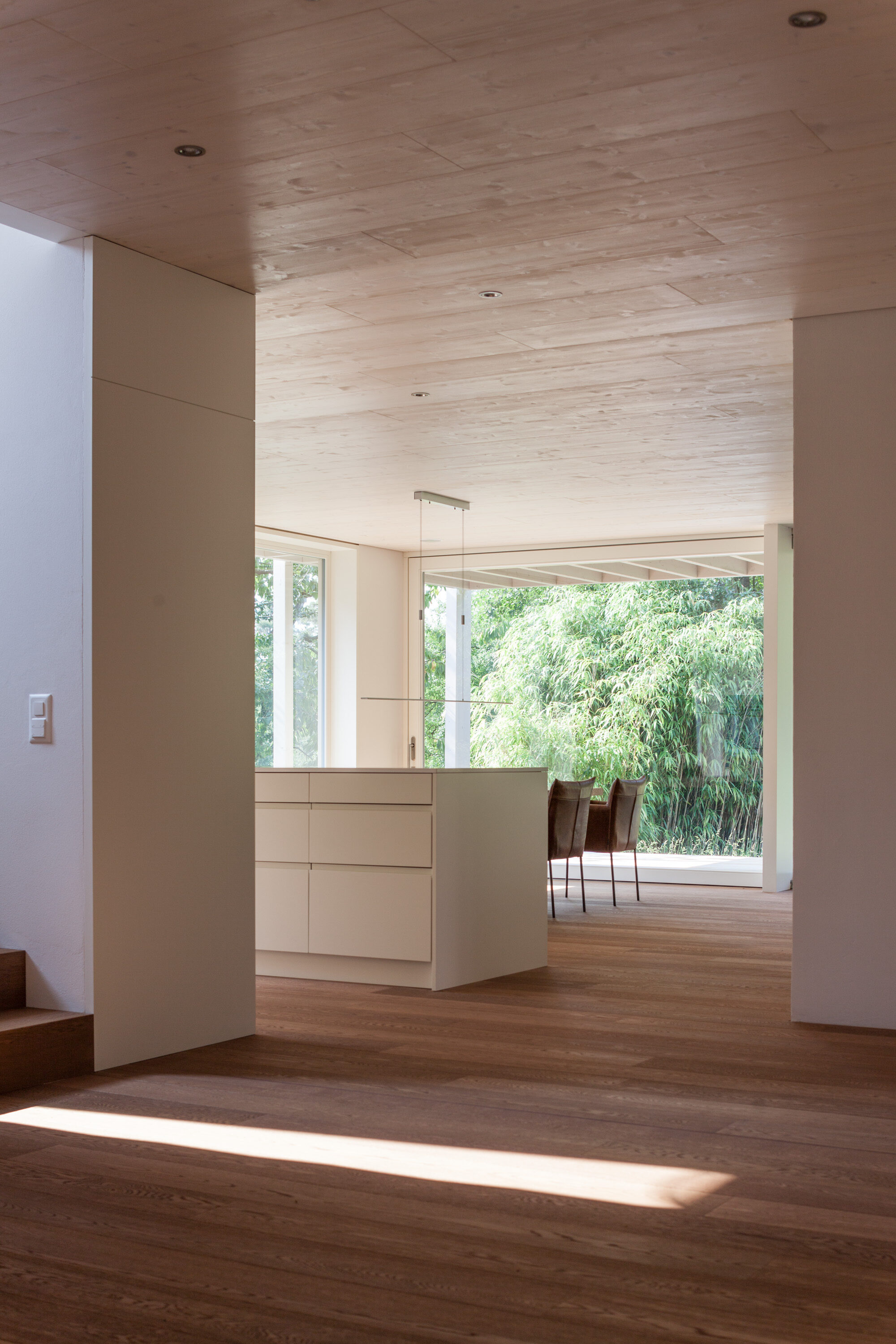 The entire house is built as a timber construction. Within, the materialisation of the timber structure is continued in the floors and the ceiling.