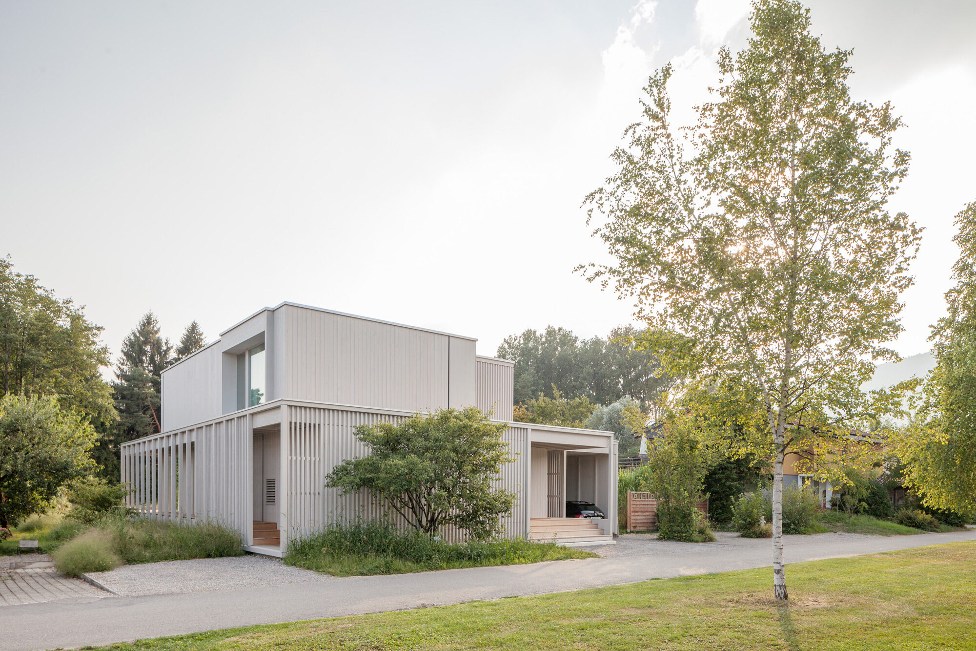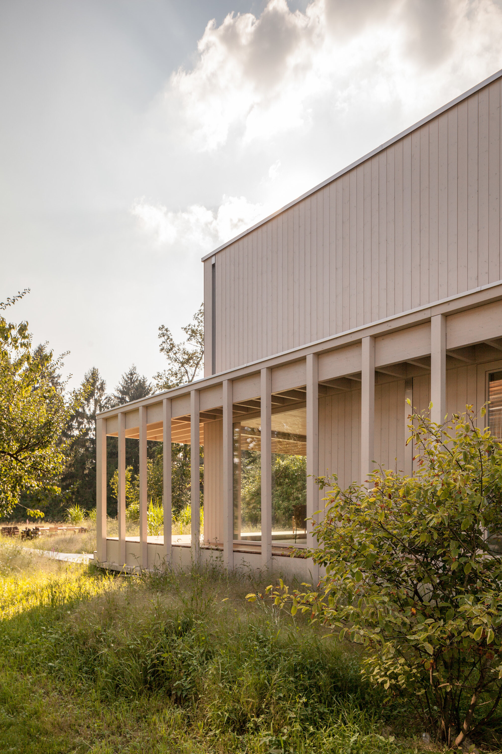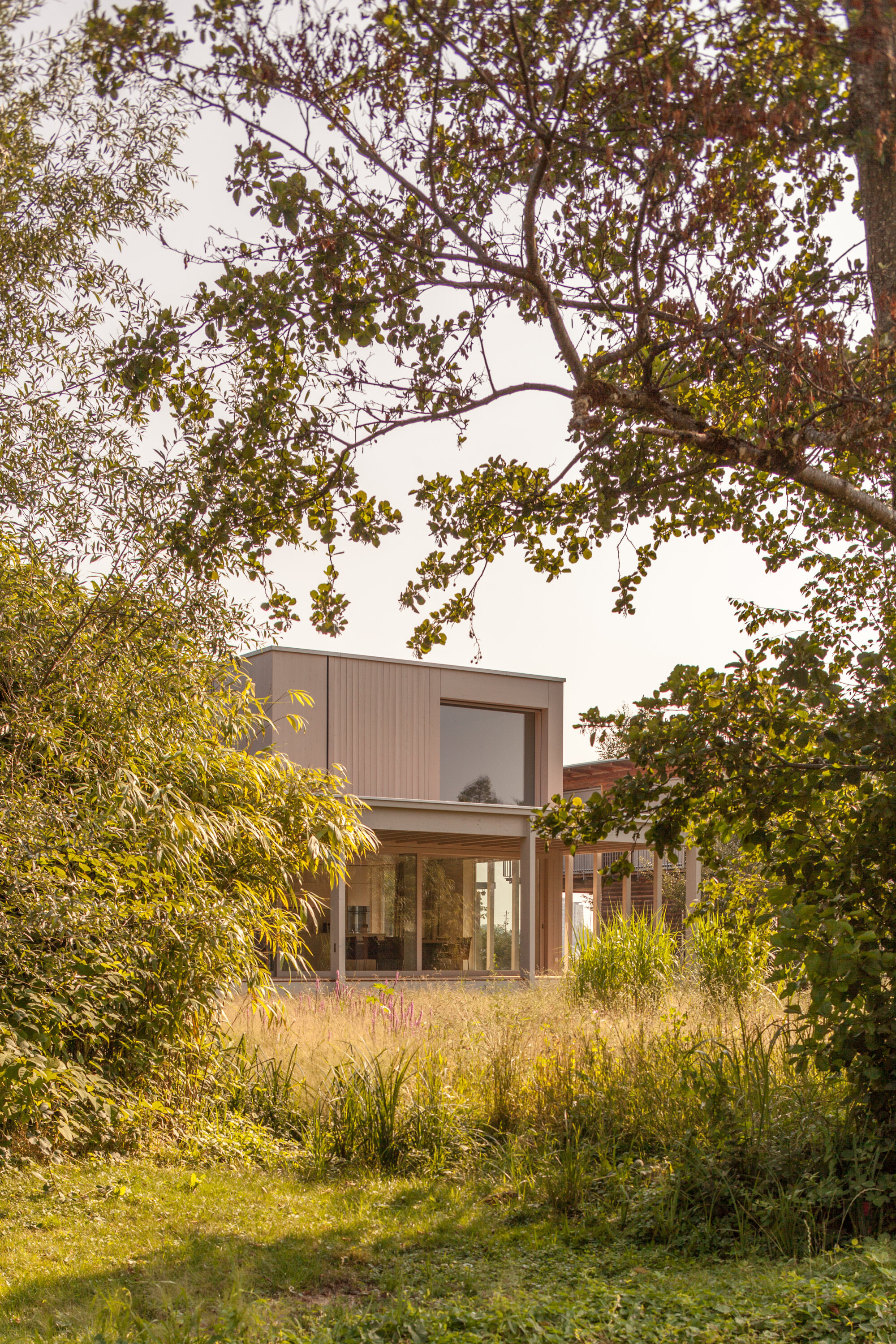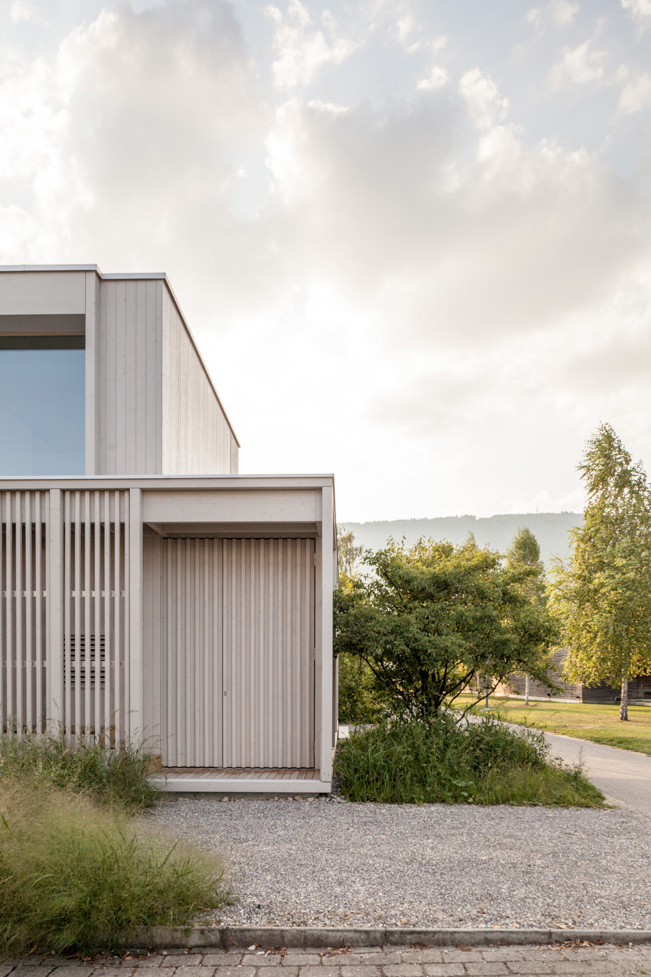 The exterior timber has been treated with a special light wood glaze. A play of light and shadow is created on the façade, which emphasises the different layers and the fine details.