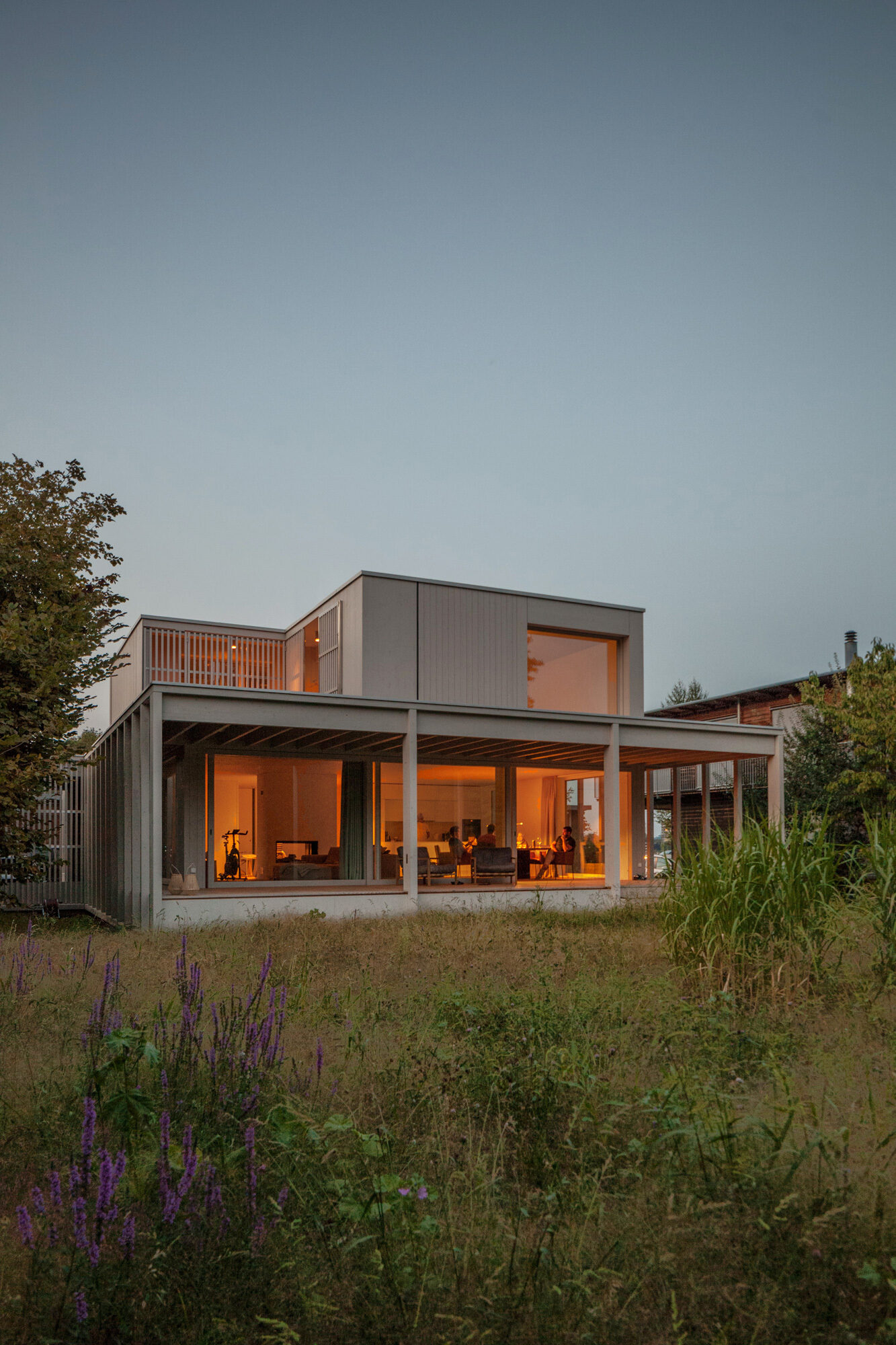 In order to be protected from small, seasonal floods, the house is elevated eighty centimetres above the riverbank meadow. Thus generous cedar wood deck is held above the shimmering surface of the lake when it overflows its banks.