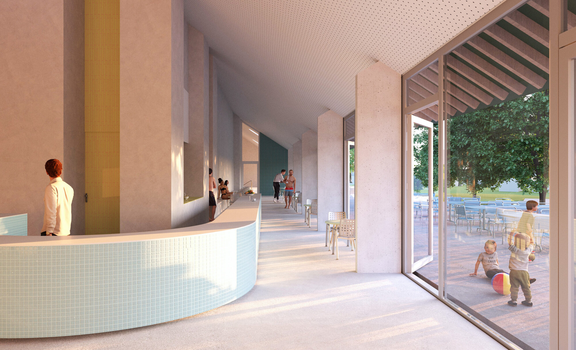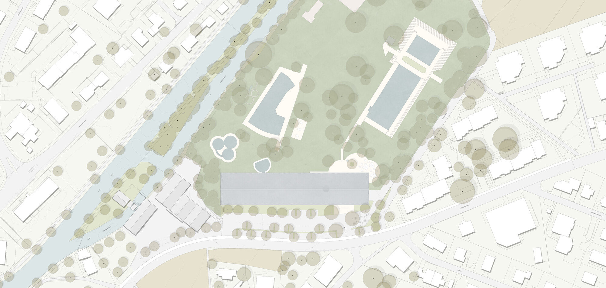 The new building can be read as a contemporary interpretation of a bathhouse that gives the indoor pool a distinct identity while also belonging to the outdoor pool and the surrounding natural landscape.