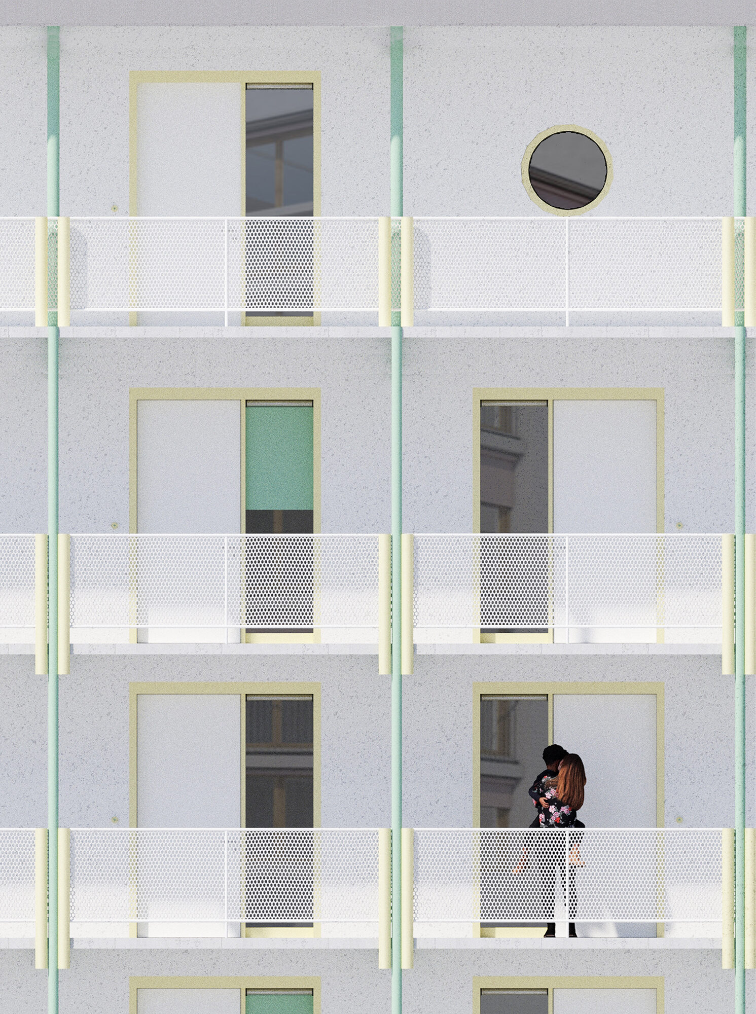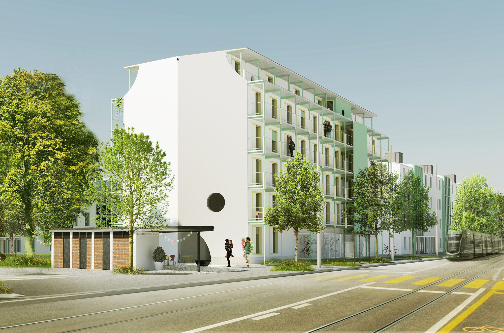 Inside, the visible wooden ceilings, durable flooring, and light-colored surfaces create a warm atmosphere. Outside, light-colored plaster facades and clear balcony structures reflect the design language of the surrounding area. The green roof, featuring photovoltaic panels, enhances the overall sustainable vision.